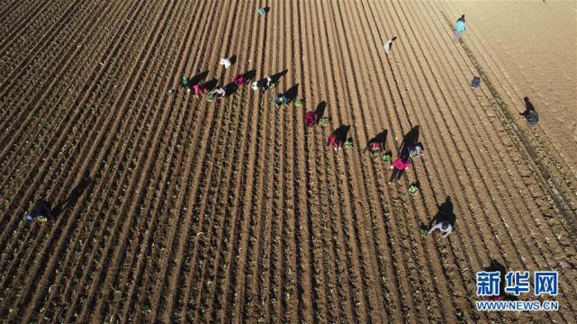 3月13日,河北省唐山市玉田县唐自头镇燕山口村的农民在田里栽植甘蓝(无人机拍摄)。新华社发(刘满仓 摄)