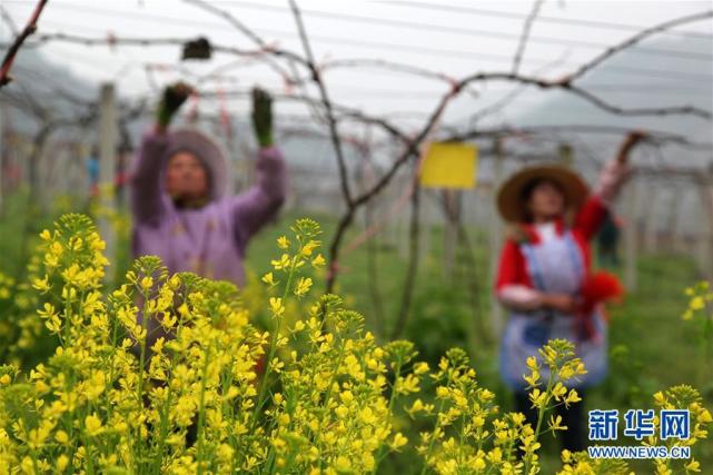 3月13日,在贵州省毕节市黔西县林泉镇增坪村猕猴桃种植基地,村民在为猕猴桃固定枝条。新华社发(史开心 摄)
