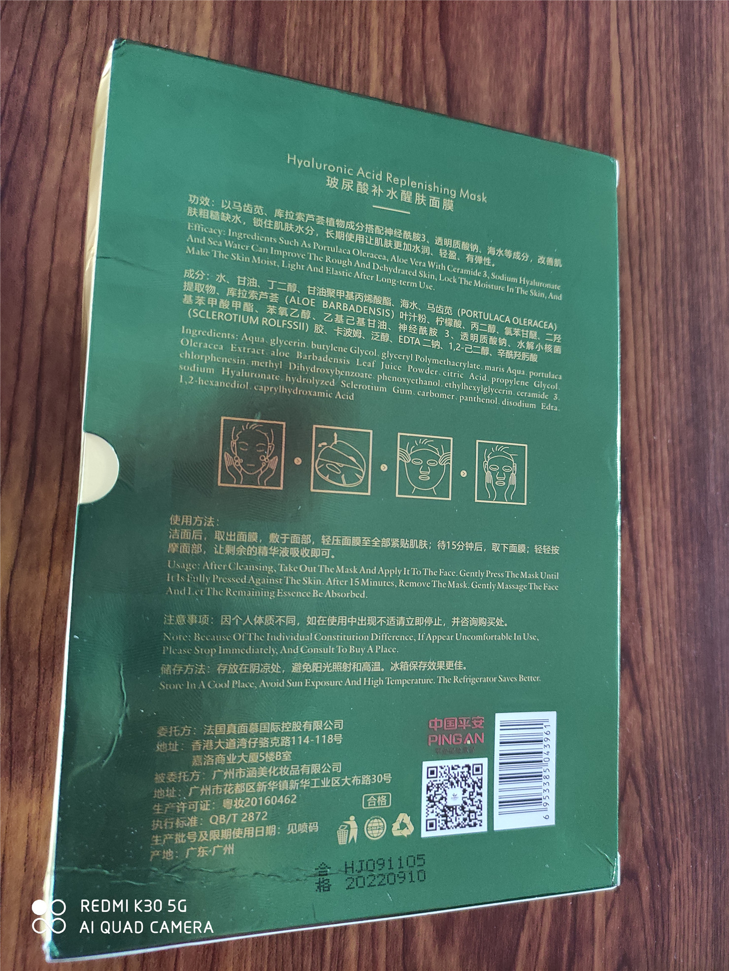 JAMIMO真面慕玻尿酸补水面膜包装盒反面,功效、成分、生产日期,保质期,厂家、地址、生产许可证、执行标准、二维码、条形码等一应俱全,让人用着放心。