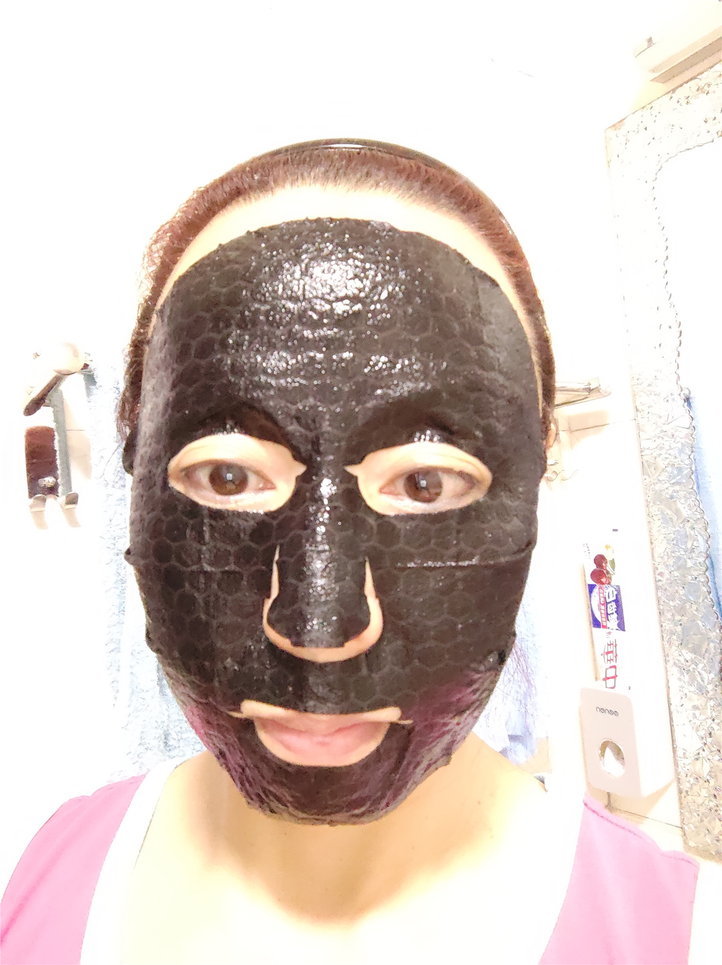 将黑色蚕丝膜布贴着脸部,轻压面膜,让面膜慢慢跟肌肤贴合,面膜敷在脸上,感觉很舒服。