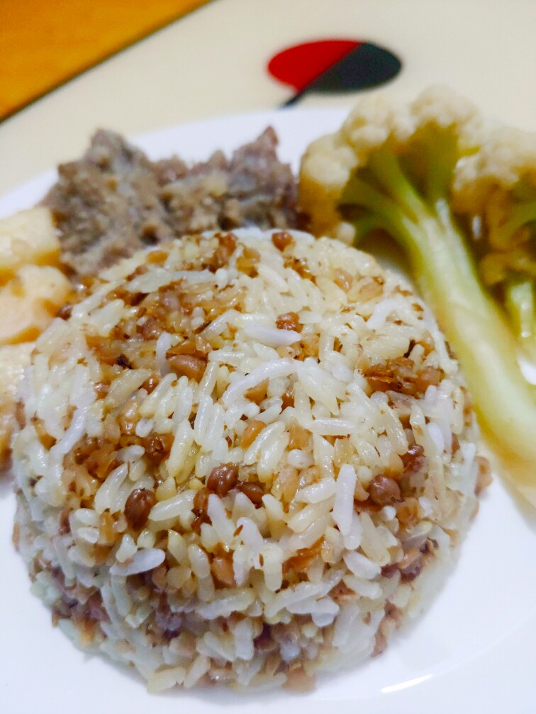 适当加入苦荞茶与大米一起煮了个杂粮饭,香糯可口,增加了米饭的风味和营养价值。