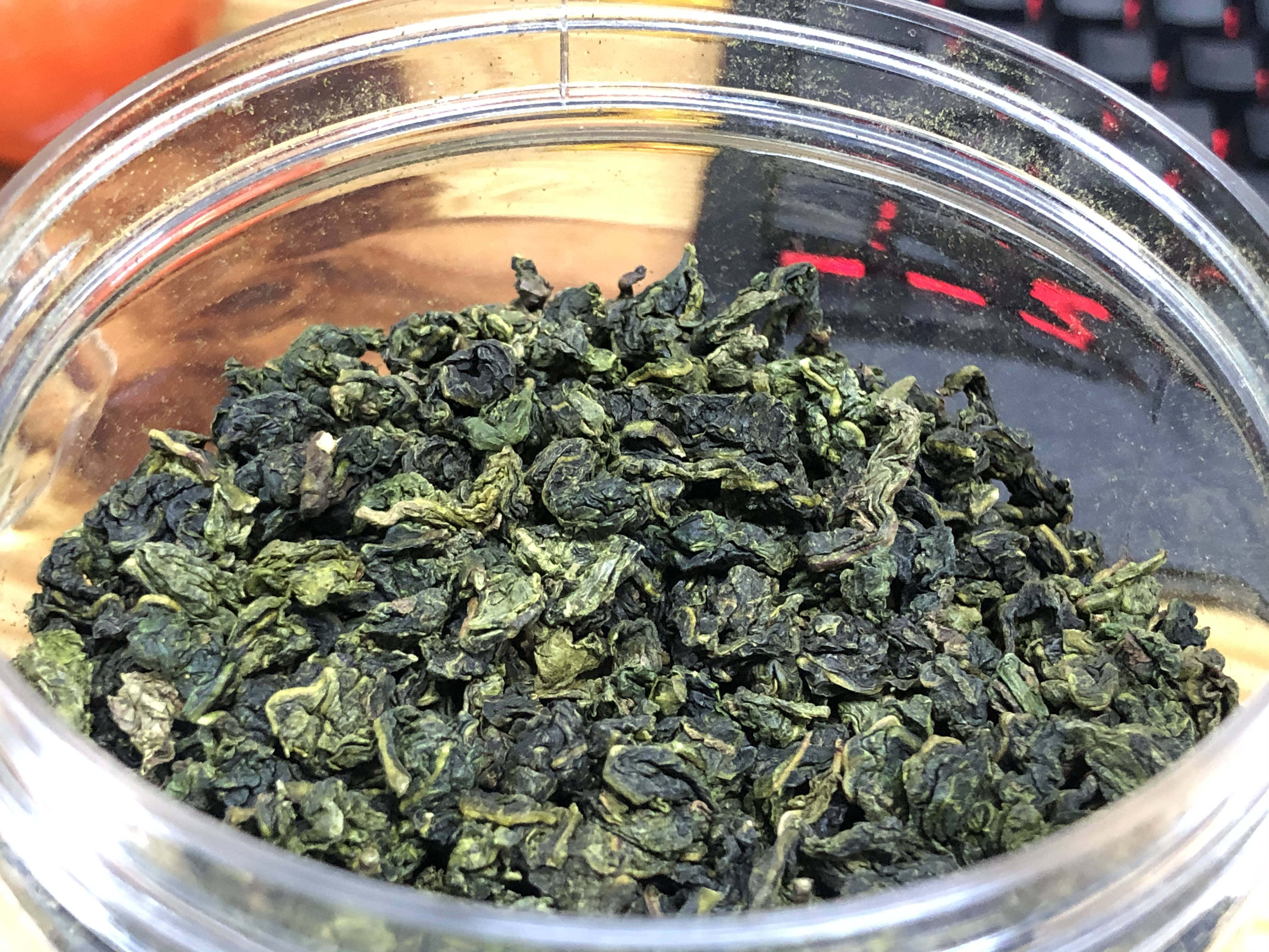 茶叶紧结饱满,颗粒均匀,色泽砂绿而有光泽。