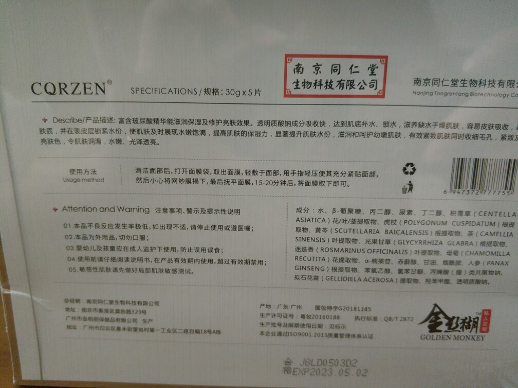 发货很快,第二天就收到了。面膜包装说实话感觉不是很好看,要素过多不够简洁。不过标明了是南京同仁堂的产品,是妆字号,也就是说这个应该不算是医疗产品。