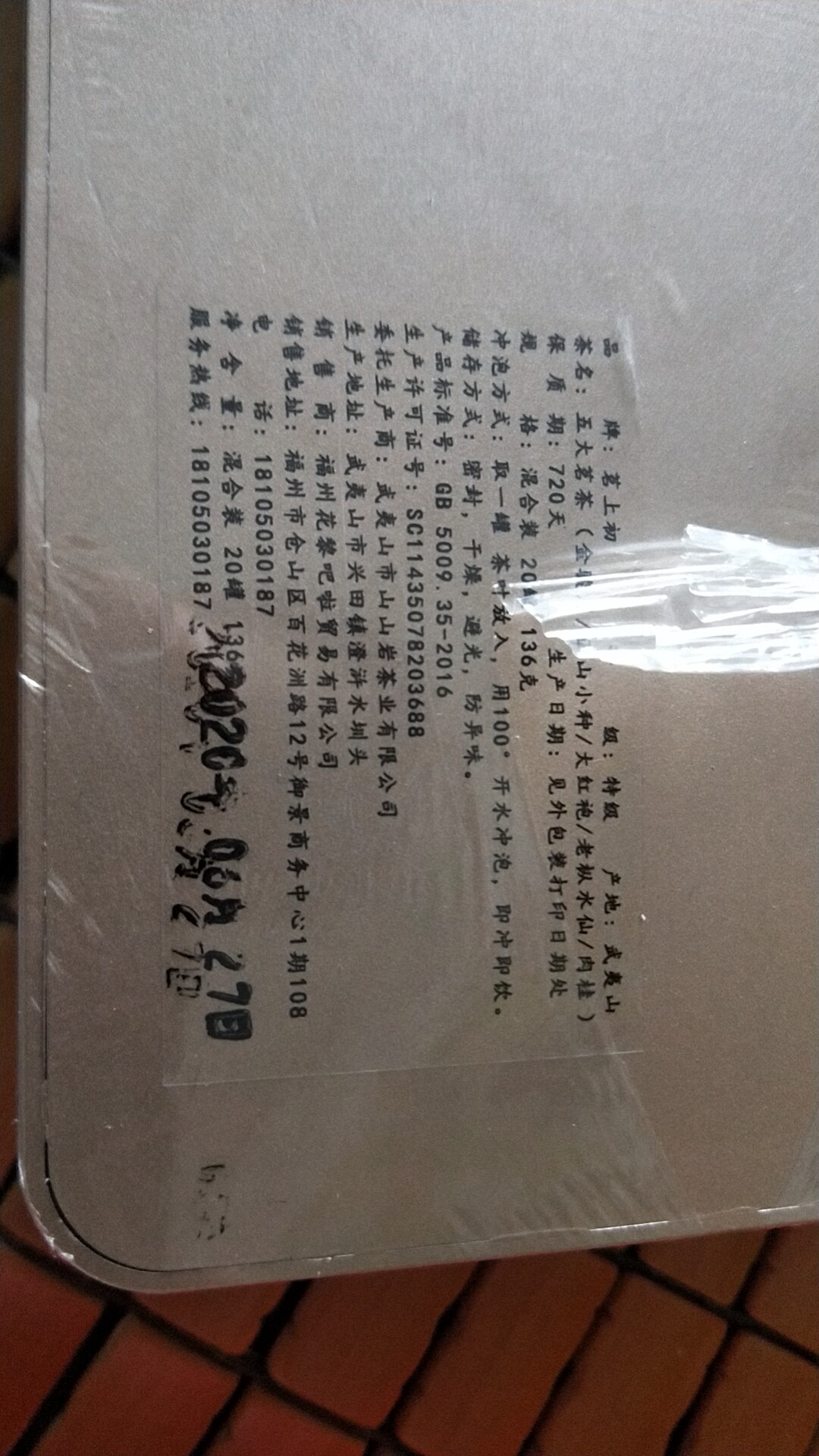 包装右下角贴有正规标签,标签上生产日期,生产厂家,地址,电话,商品名称,保质期,规格,储存方式,冲泡方法,生产许可证号,产品标准号,净含量以及服务电话等等一应俱全。
