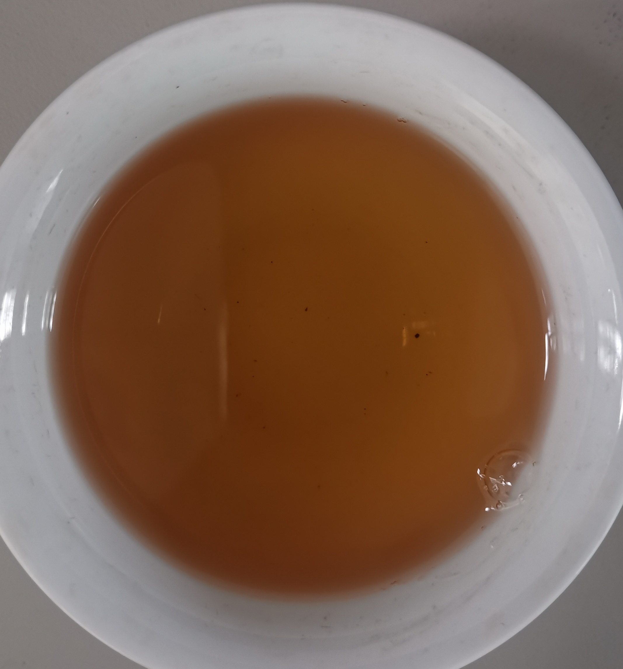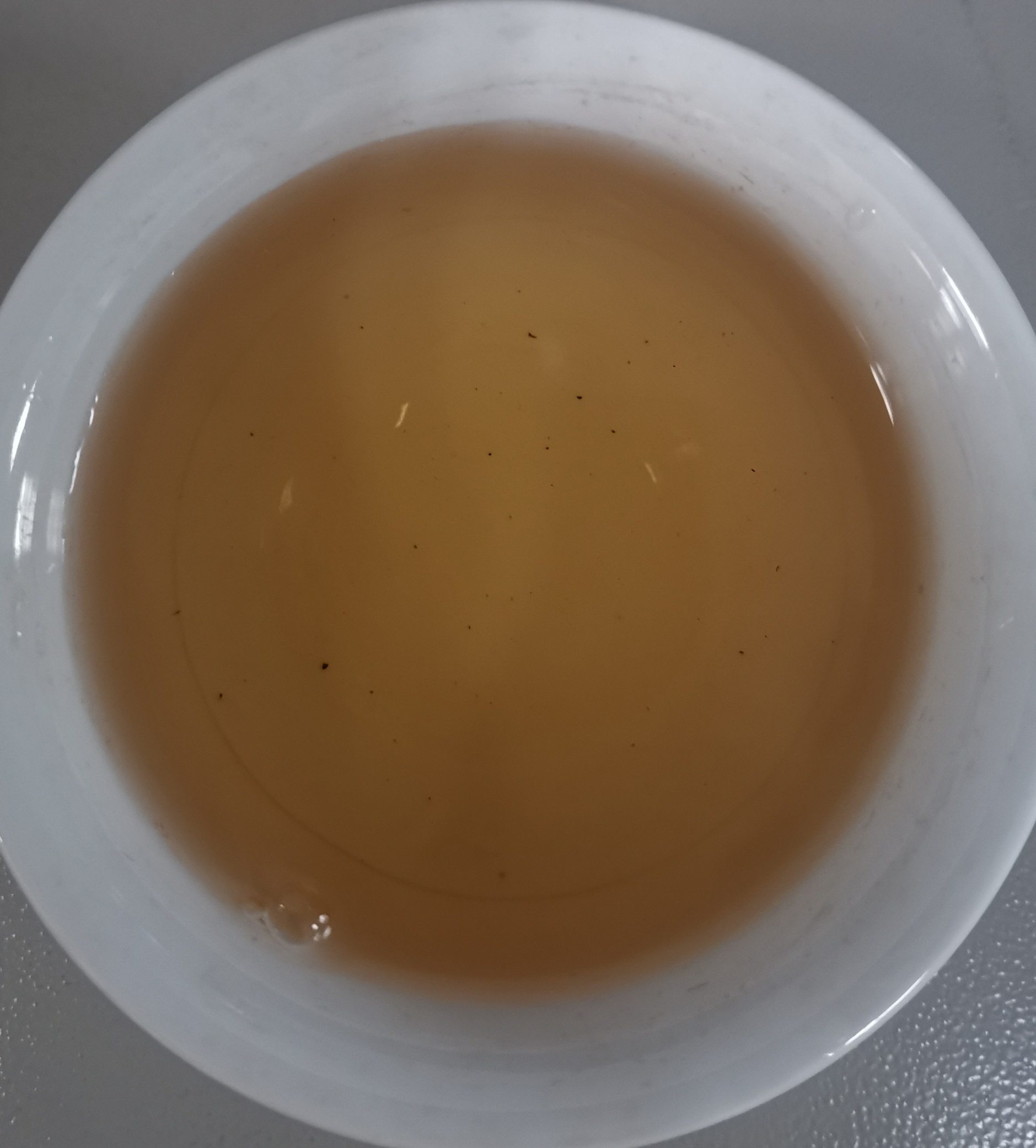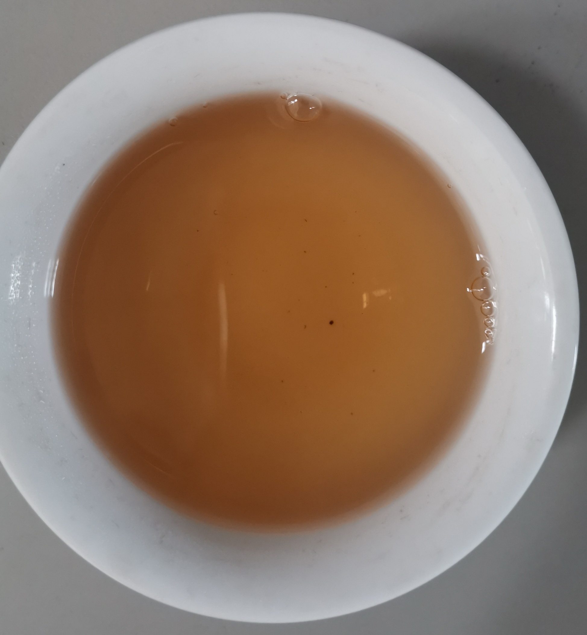 第一泡后的茶汤,汤色呈深橙黄色,明亮通透,入口顺滑有苦味,喝后有余味。