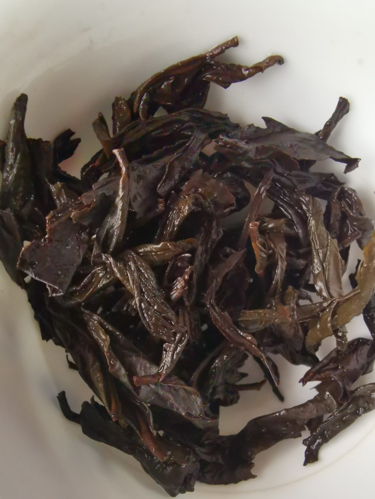 细看茶叶,条形不是太紧,茶叶呈红褐色,闻之有清香味,表面有焙火后的小白点。
