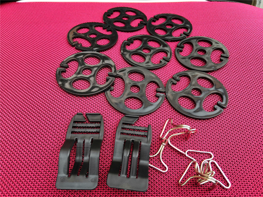 八个塑料卡盘和金属挂钩,还有两个塑料的连接扣,可是收到的时候就有一个已经坏掉了。