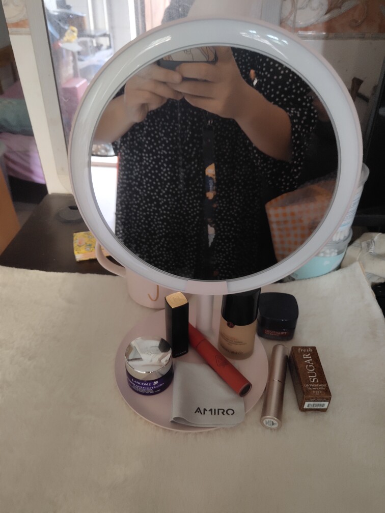 镜子支架磨砂质地,很有质感很高级。颜色粉嫩,满足你的少女心,拥有一个完美的化妆体验。底座可以摆放物品,镜头可以自由调节,实用性强。不开灯的情况下也可以照镜子,开灯的情况下,照出面对面的真实感。
