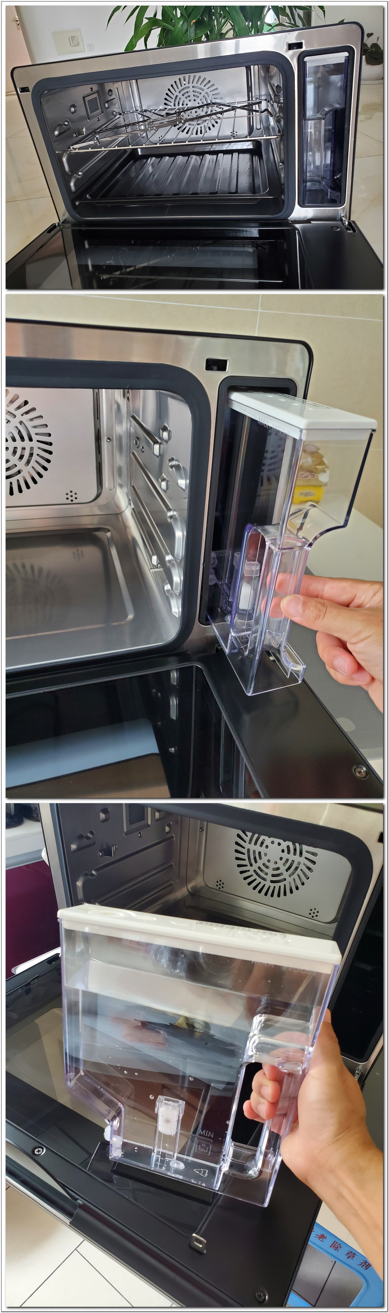 西屋新品40升蒸烤一体机虽然占用厨房空间小,但内部却有一个“大世界”。烤箱腔内拥有4层实用空间层架设计,可以放置烤盘、蒸盘或是烤网,分层设计可以一次性烹饪多盘食物,40L的超大容量,容纳整只鸡或鱼的蒸制,轻松满足朋友聚会、家人聚餐等多种场景需要。同时,主机里已经放好了水箱和配备好水槽,水箱容量是1450毫升,还算是比较大的,水箱内部有一个磁铁式传感器,里面的水快用完了会报警并且停止加热,就不怕水烧干啦。用来接冷凝水的水槽在机体下方,可以简单抽出来,第一次使用之前建议简单擦拭一下。其内置1450ML的大容量水箱,可实现超长续航的蒸制时间,蒸菜过程一气呵成,可以尽情发挥你的烹饪天赋。