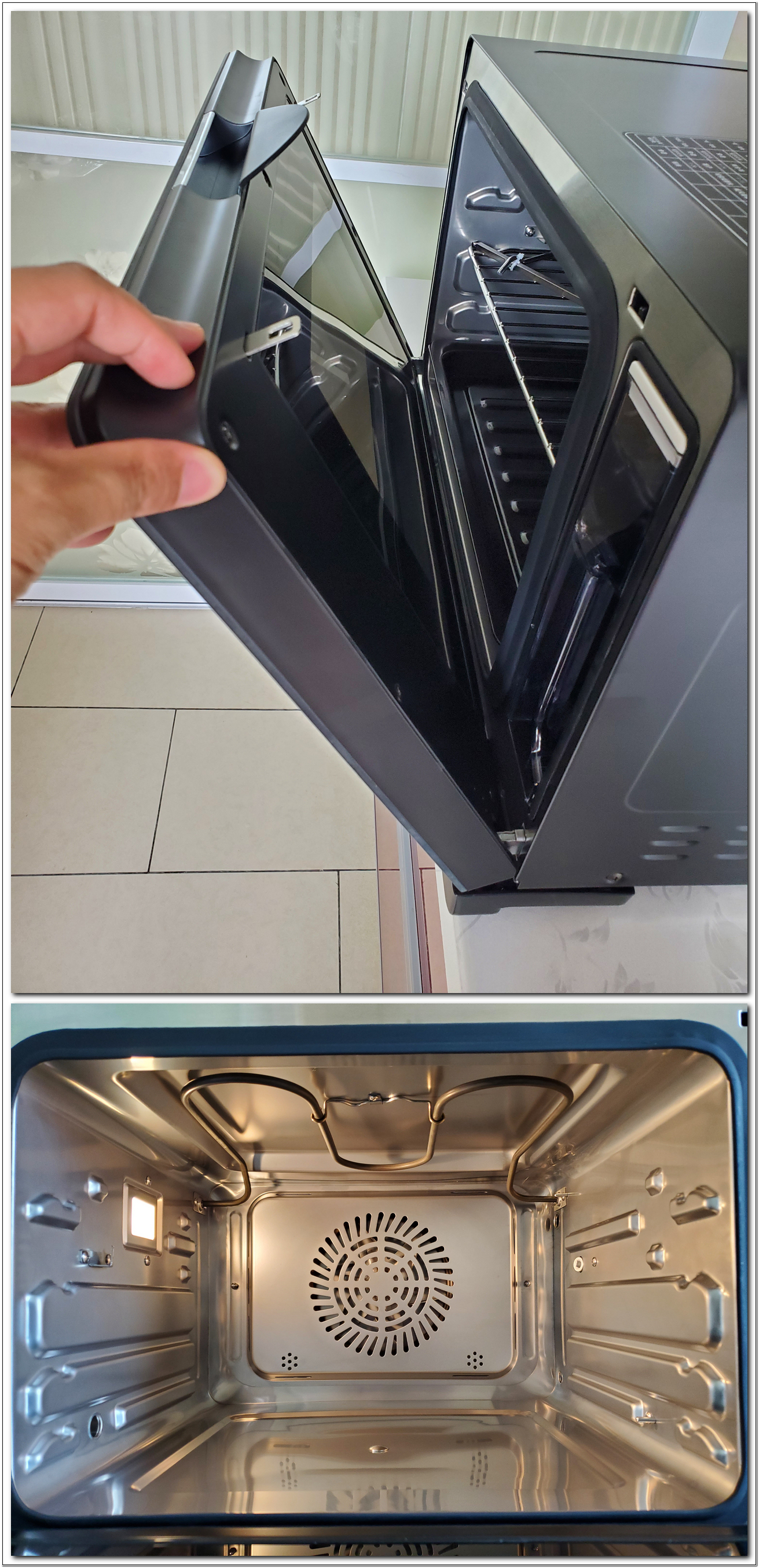 西屋烤箱拥有40L的大容量,一般家庭使用制作西点或者蒸菜都没有问题,烤箱采用的是上下后管发热技术,上管功率达到900w,下管隐藏式的,功率有700w,后管功率900W,蒸发器功率1100W,烘焙食物的时候通过4D循环加热方式进行的。 而且打开舱门可以看到整个蒸烤箱的内胆非常漂亮,是无缝焊接的,不仅清洗方便而且看过去很有质感。左边的照明灯能够在烘焙食物的时候不用开启舱门进行查看,更加省事,打开或关闭舱门阻尼非常棒,阻尼可以悬停任意位置,这种设计非常贴心!