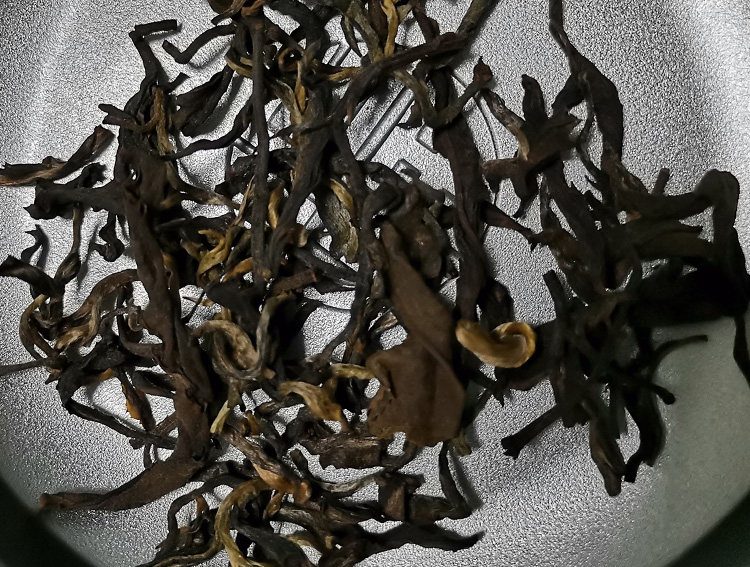 茶叶黑色,深红色,夹杂着金色。