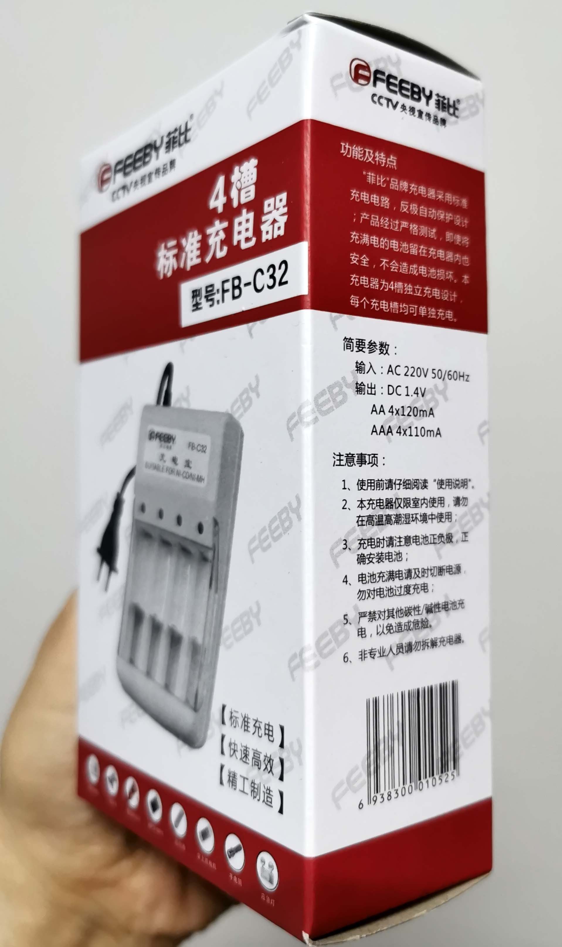 所配FEEBY充电器外包装上虽然也标了充电参数,但与里面的实物充电器上所标的参数确不太一样,我以前有个电池容量测试仪,好久不用也找不到了,只好下面简单估测了。