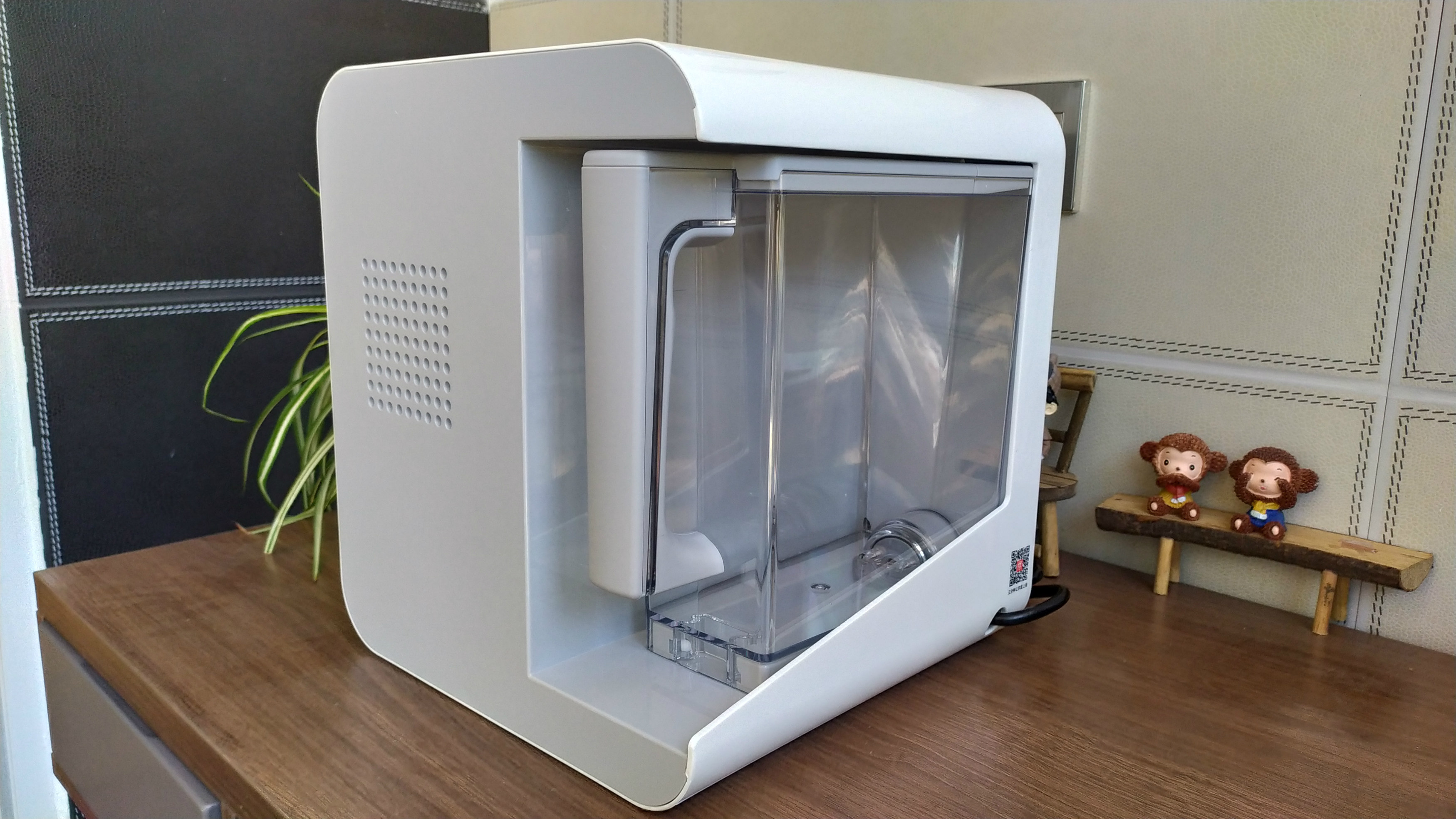 2L的水箱在机器的背面,无需过多操作,直接轻轻一拉即可取出,透明水箱的好处就是水质及其清洁程度一览无余。水箱的盖子可以拿掉,方便加水和后续清洗。