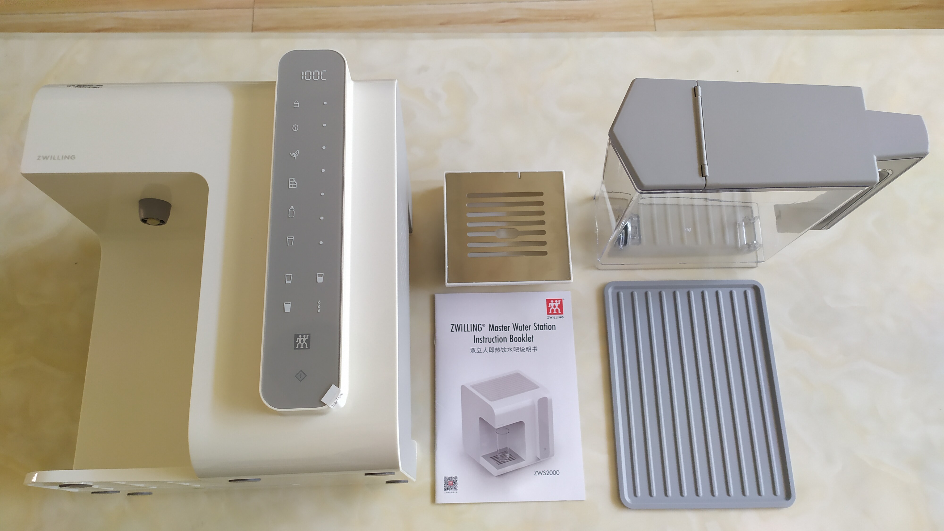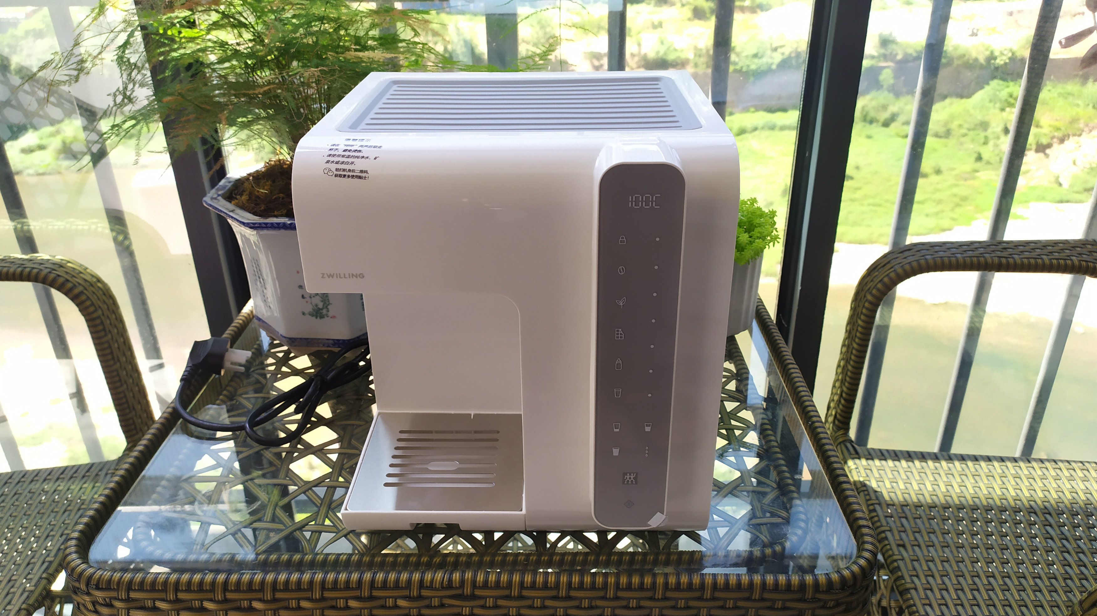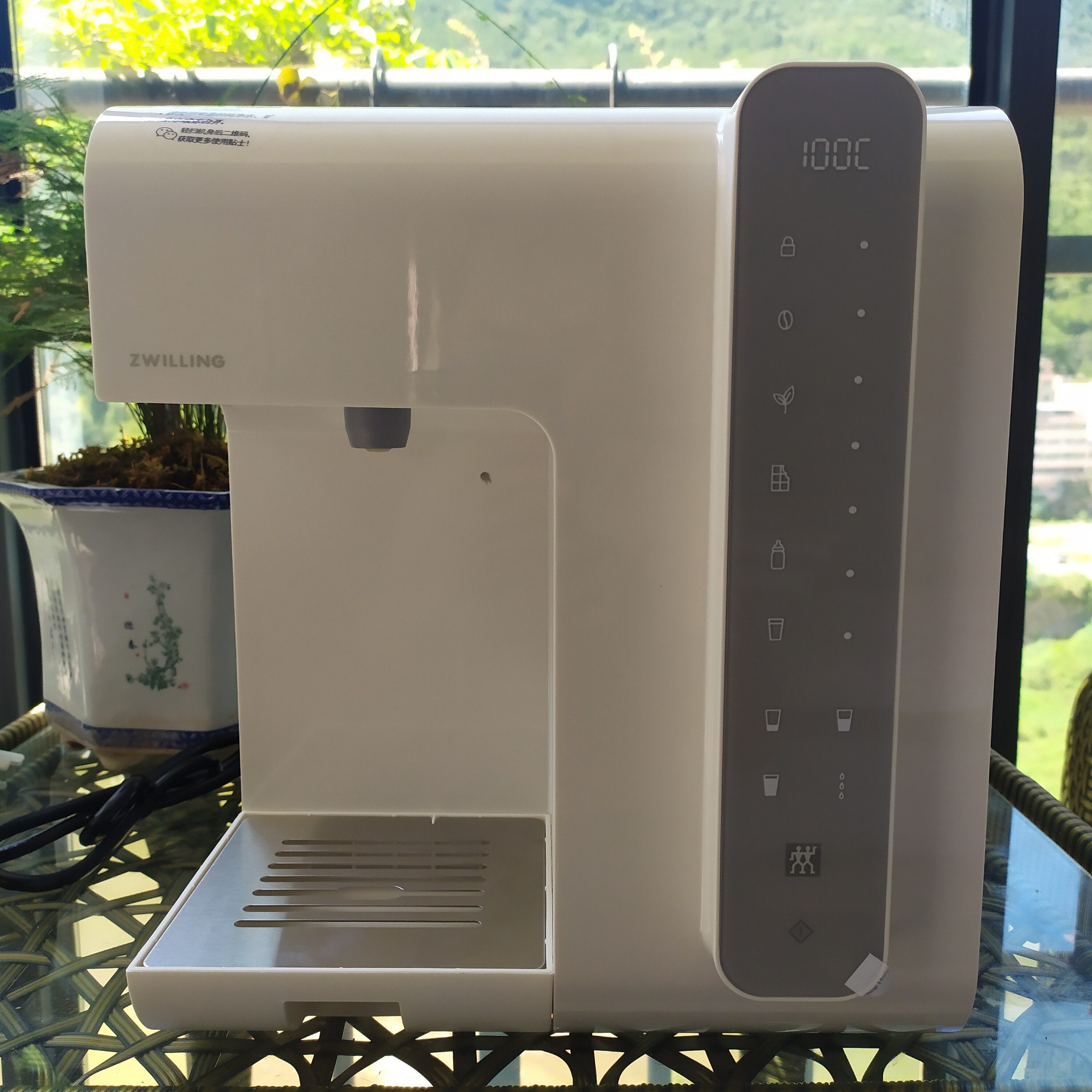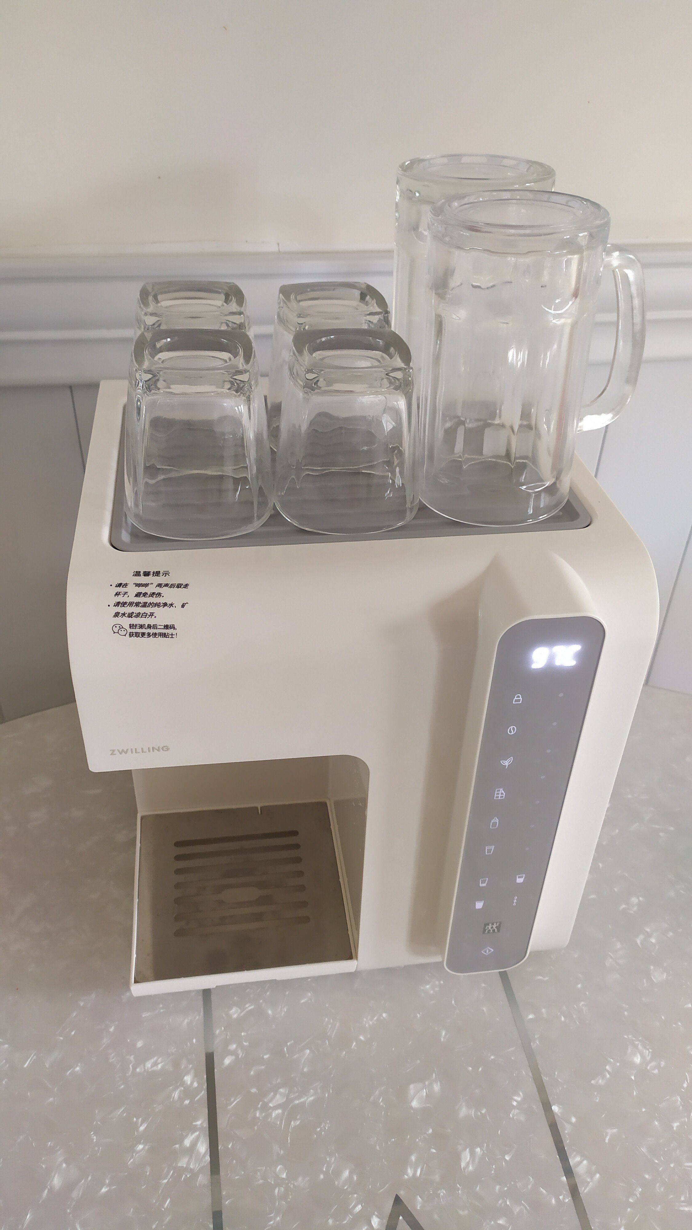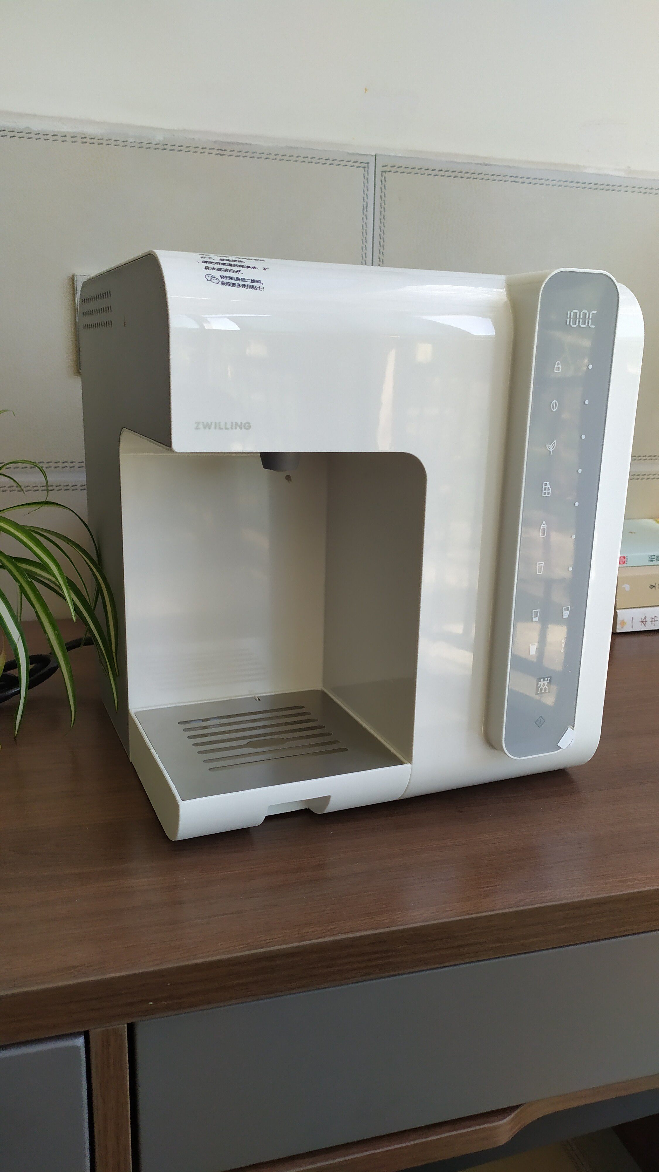 印象中的即热直饮机体格都挺大的,才能做到快速烧水。这款双立人直饮机,简约设计,颜值高,3秒速开,拒接千滚水,长宽高仅仅为26*28*30厘米,体积小巧,全部采用触摸按键,配备2L抽拉式透明水箱,温度从40-100℃可调,真正的沸腾开水,并且还有多种出水温度可一键设置,满足不同场景的需求。沥水盘可拆卸,即使是杯身比较高的水杯也能轻易接水。机身底部有不少的防滑垫,放置稳定也很可靠,此外,看了下说明书还有自动清洗功能等等,非常的人性化设计。