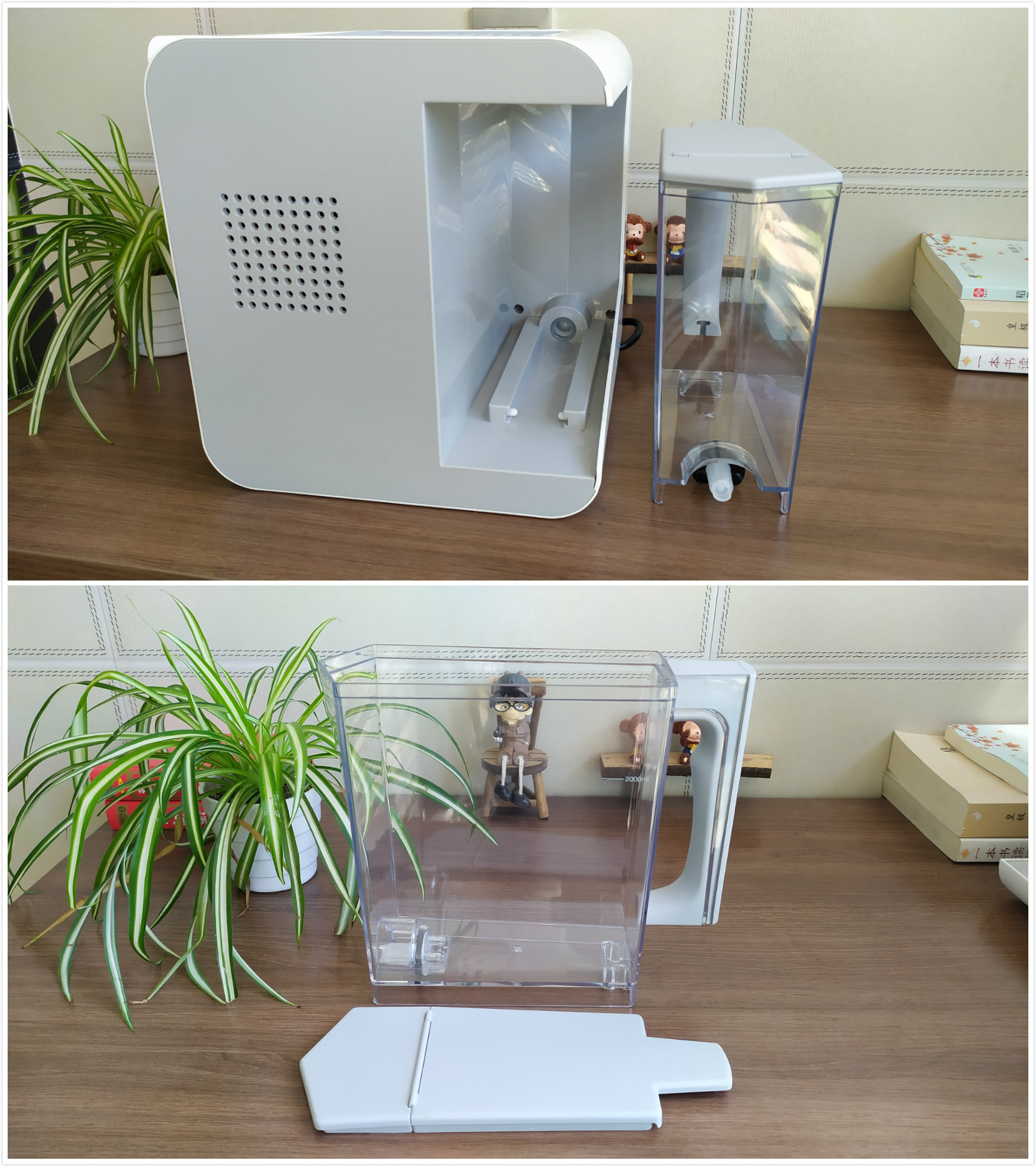 这是拿下水箱的状态,水箱底部还有点门道,要保证装满水不会漏出来,接上机器也不会漏出来。刻度2L的水位线距离顶部还有一段距离,反正我每次加水都是超过刻度线的,使用也没有问题。可以加矿泉水,经过净水器净化后的水,桶装水或者凉白开,提示水箱中不要加超过60度的水。
