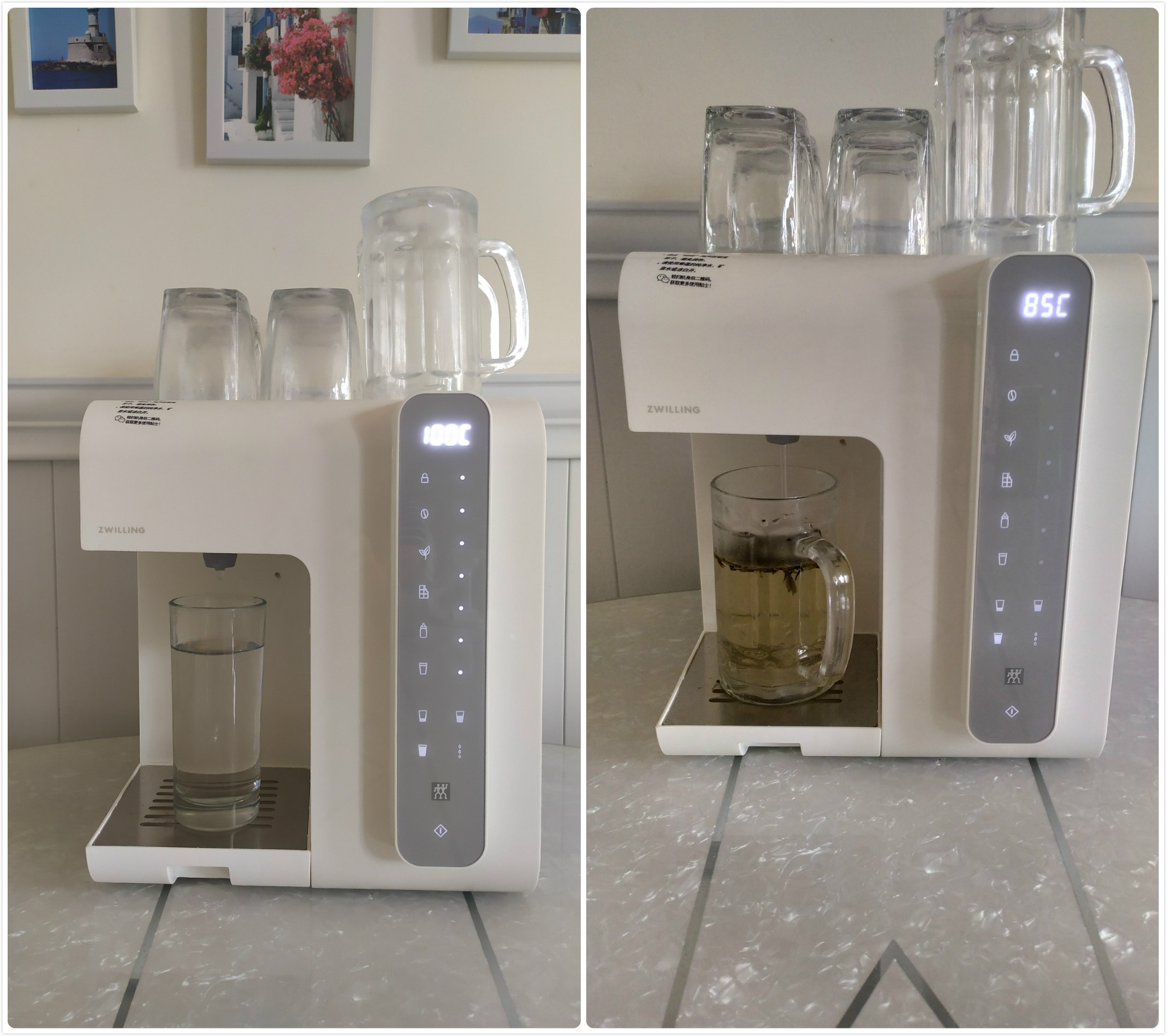 实测顶部可以放下六个水杯,不建议再在杯子上面叠一层了。因咱们四川很多地方老人都称没有烧开的水为阴阳水,喝久了就对身体不好,这个100度我还专门测了一下,妥妥的!当然这只是地方习俗,有些地方更讲究,碧螺春只能用70度的水来泡等等。所以别看他面板上显示得有点多,在使用习惯上就照顾了更多地方的人。