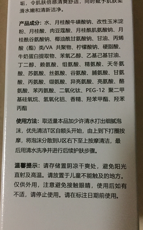 洁面乳为白色的膏体,味道淡淡的,没有刺鼻的香味,加点水揉搓出来的泡沫非常细腻,两只手上都是泡,没法拍照片了。