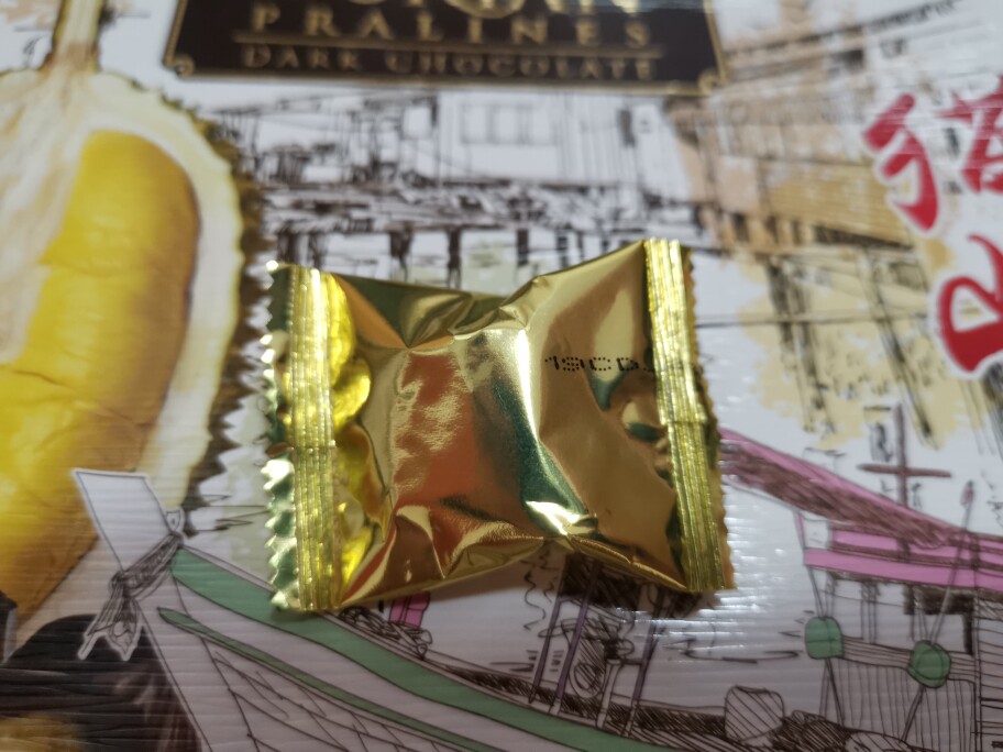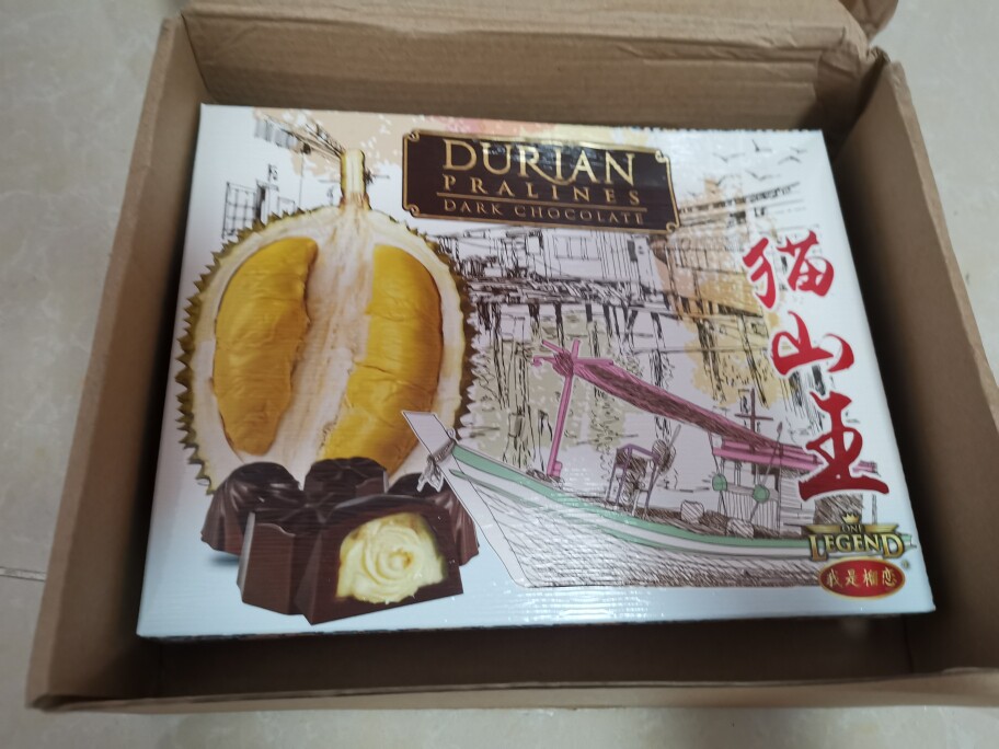 物流速度快,外面的包装纸盒有点被压到,不过巧克力原包装没事。外包装质感很好,也很有设计感。味道还不错,浓浓的榴莲味。日期也很新鲜。