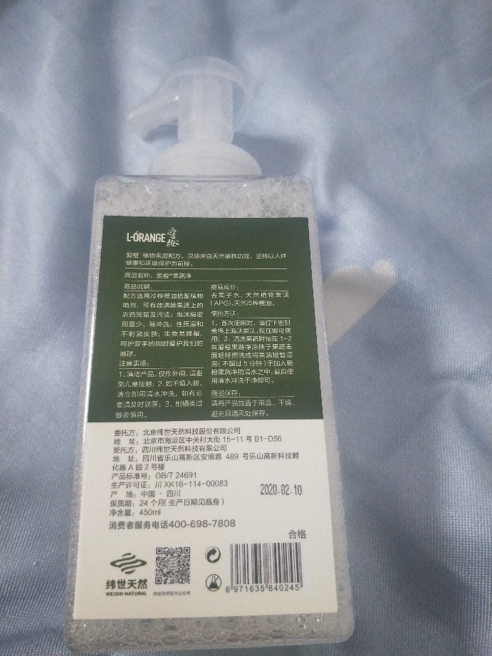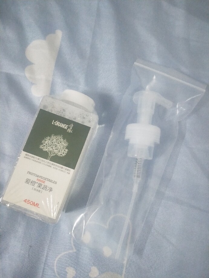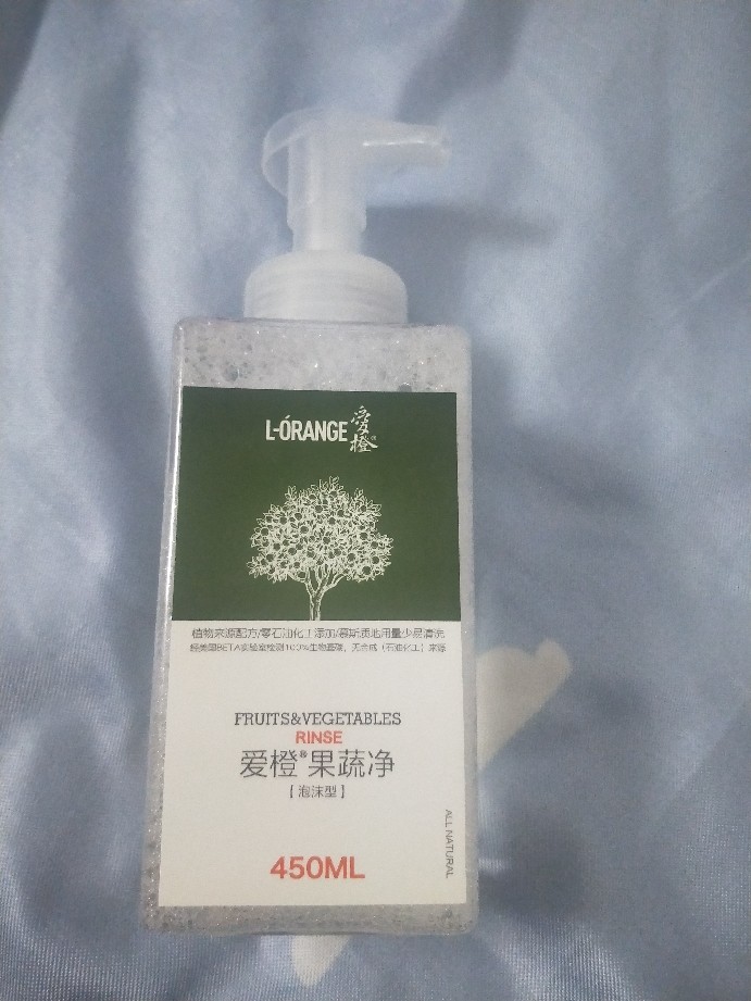 名称:爱橙果蔬净(泡沫型) 规格:450ml(可以用挺久了) 气味:清淡的柑橘味 理念:植物来源配方,灵感来自天然植物功效坚持以人体健康和环境保护为前提。(很棒)