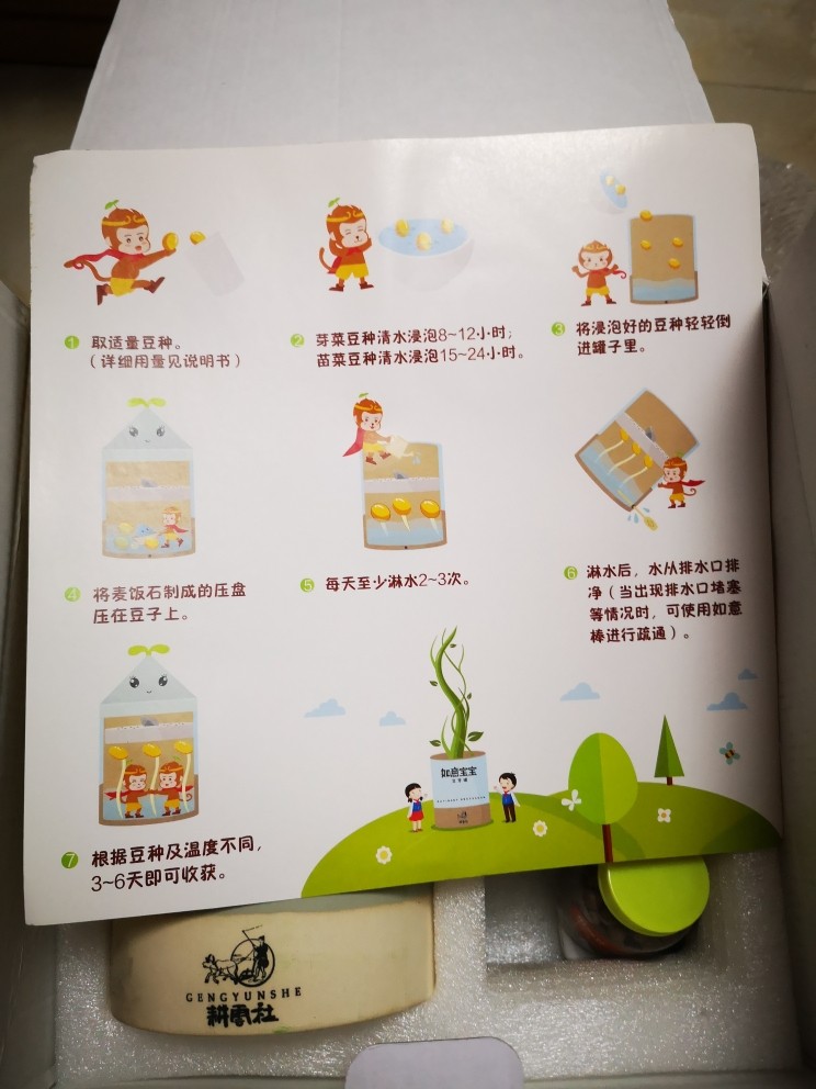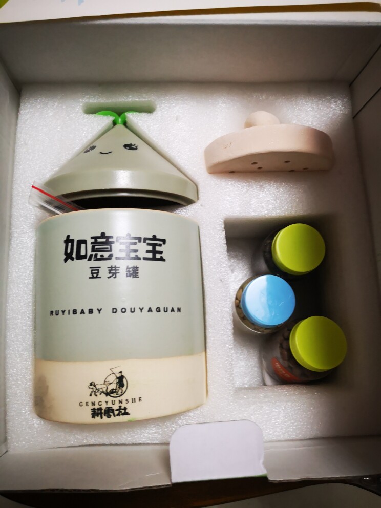 四天前收到豆芽罐,小朋友非常喜欢, 宝贝包装完好,里面有陶瓷罐子,可爱的蜗牛盖子,还有观察记录本和几瓶种子。 我们用了四天时间把绿豆发成了豆芽,孩子每天负责浇水,很好的学习了如何种豆芽