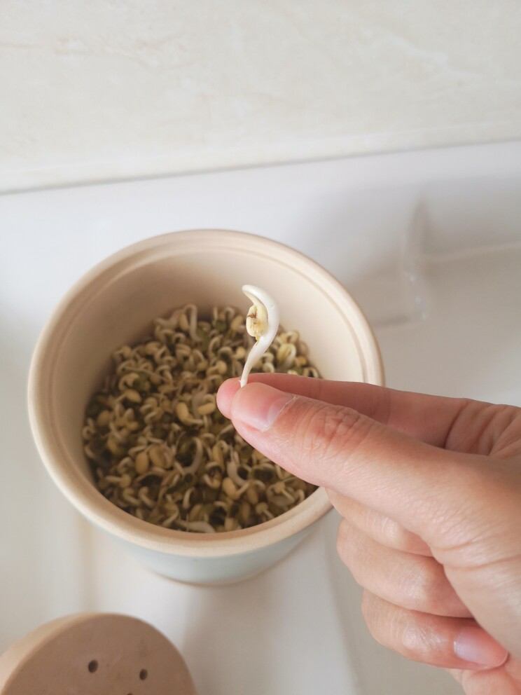 第四天早上,豆芽已经有罐子高,盖子已经盖不下了