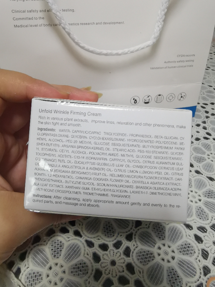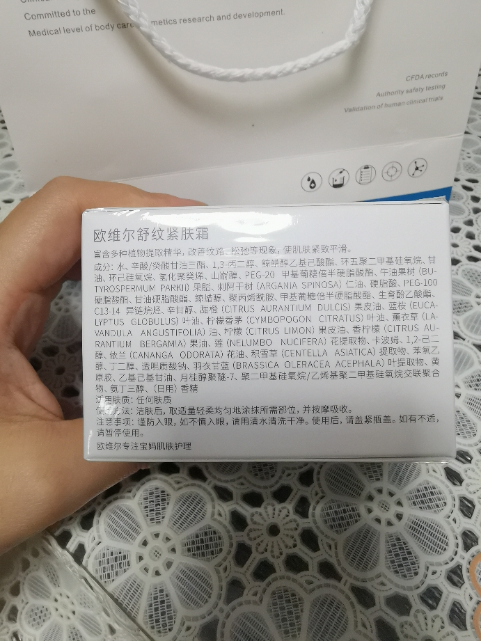 外面有一个手提袋,打开里面是封闭很好的霜。上面有清晰的介绍,有医美的感觉。