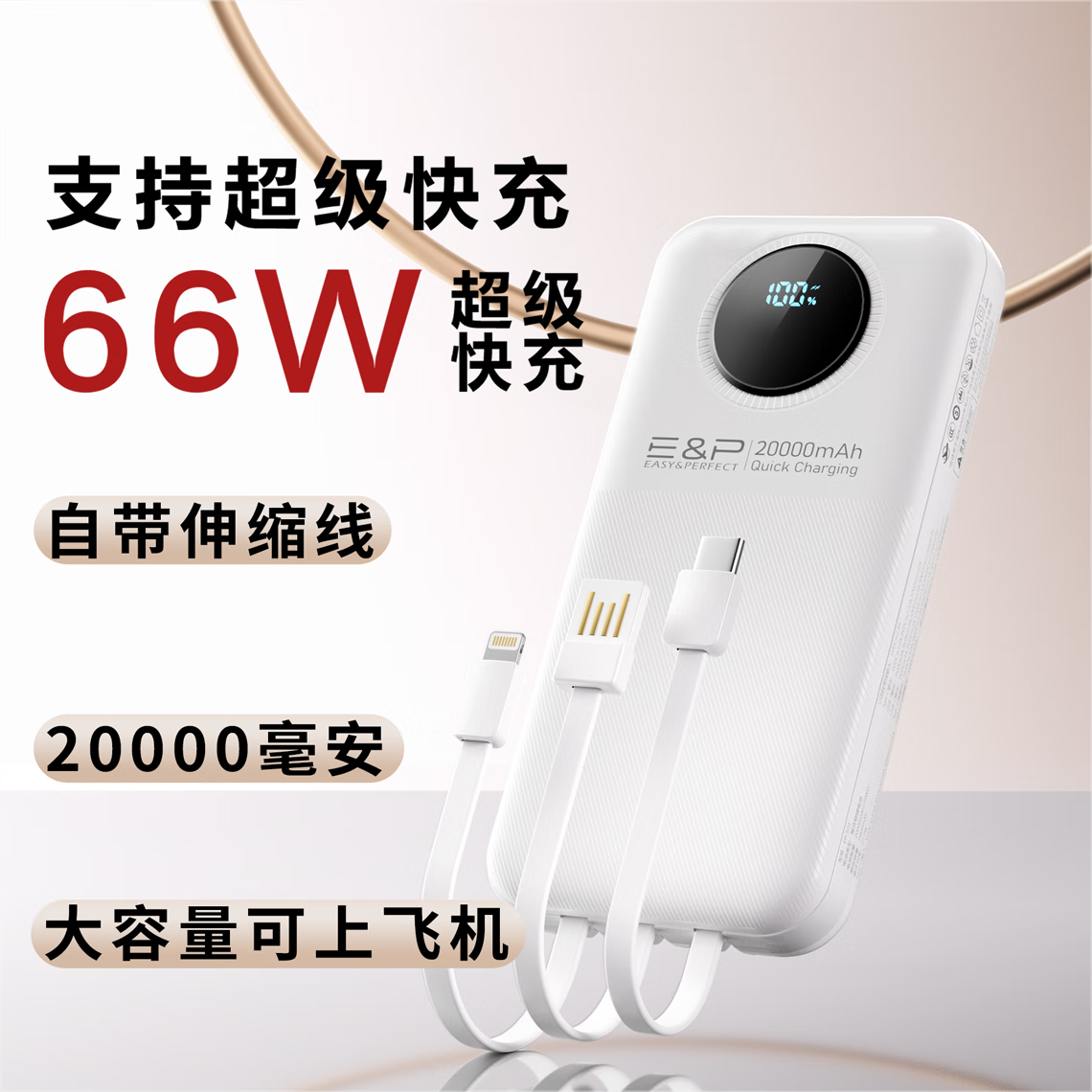 帆势3C认证磁吸自带线充电宝10000毫安快充超薄迷你超大容量便携移动电源适用于华为小米苹果可上飞机 白色 10000毫安磁吸