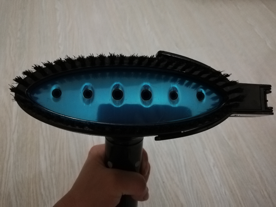 喷头手柄本身也是防烫型,圆润弧形设计,符合人体工程学,手握更舒适,操作更方便。蒸汽喷头面板色泽为宝蓝色保护膜,撕掉保护膜后,是不锈钢材质的镜面,表面光滑平整,不伤衣物,上面有六个环形蒸汽孔,能均匀分布蒸汽提升穿透力。店家配了毛刷,可以让蒸汽更容易渗透织物,在熨烫过程中理顺衣物,使之更为平整有型。