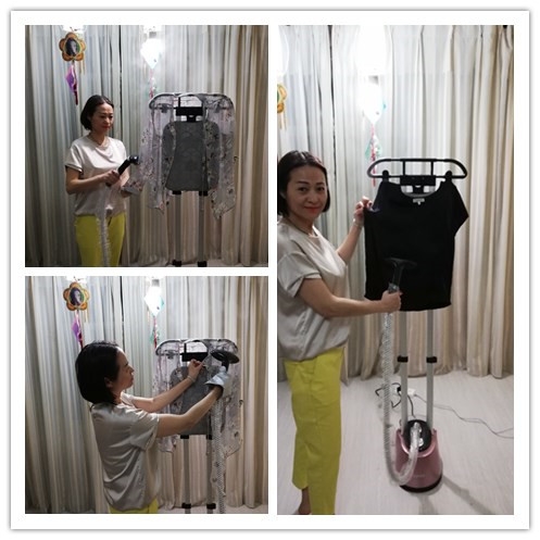 苏泊尔挂烫机第二种方式一一挂烫!因为是夏季,我熨烫的都是真丝衣服,真丝花衬衣挂放在调整好的衣架上,黑绸缎?恤因为是套头衫夹在衣架上,开启到丝绸档,不到3O秒蒸汽就澎湃而出,熨头所到之处,褶皱消失,衣服瞬间平顺! 加厚铝合金双杆,以黑色搭扣固定,三段自由伸缩,自由调整高度,满足不同高度人群使用,配合两种熨烫方式,操作简单便捷!