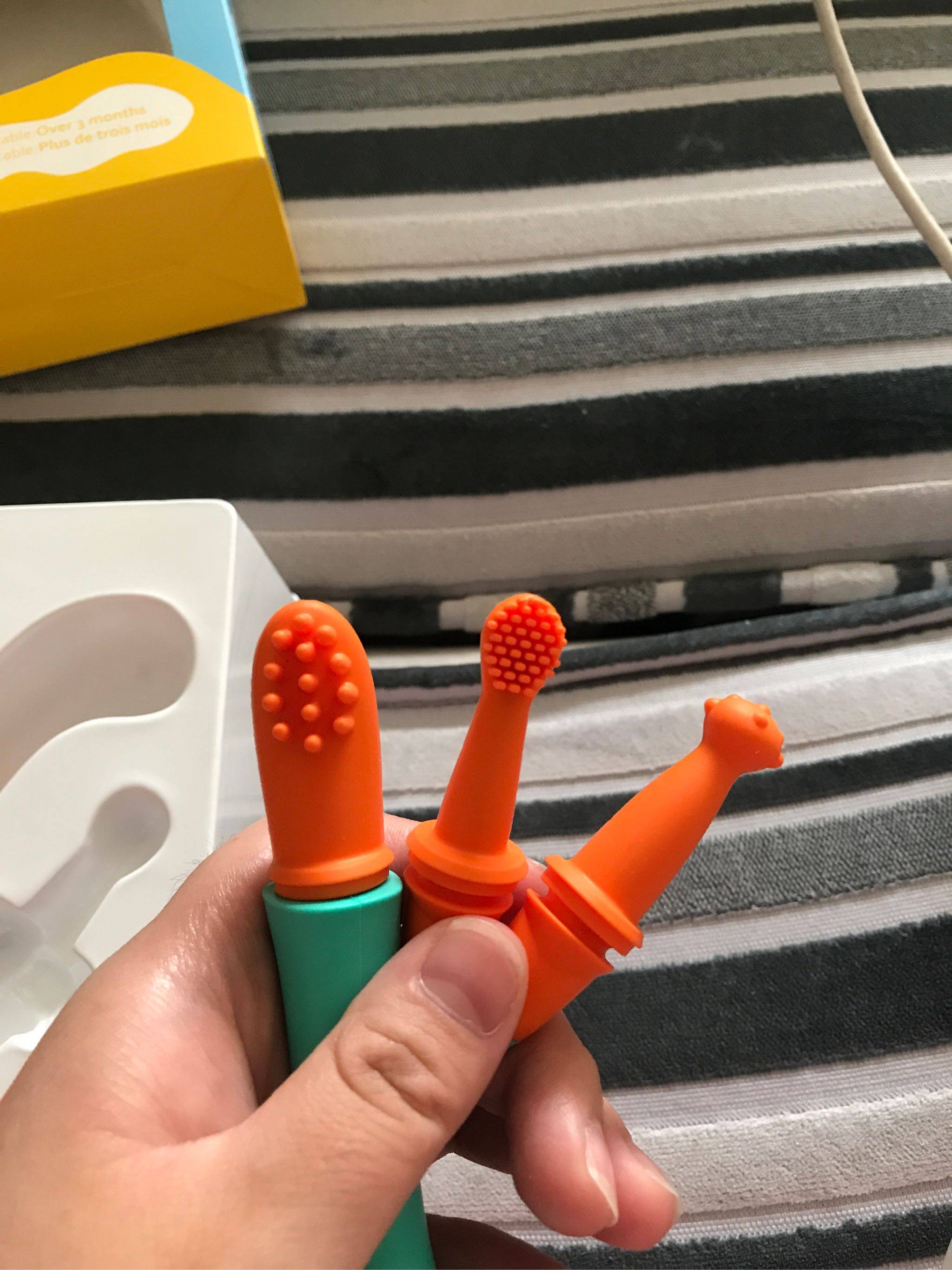 优点:颜色鲜艳,丰富宝宝得视觉,容易抓握,锻炼宝宝的协调性。 材质是硅胶的 安全不会伤到宝宝。带着三个不同得刷头,满足不同年龄的宝宝。