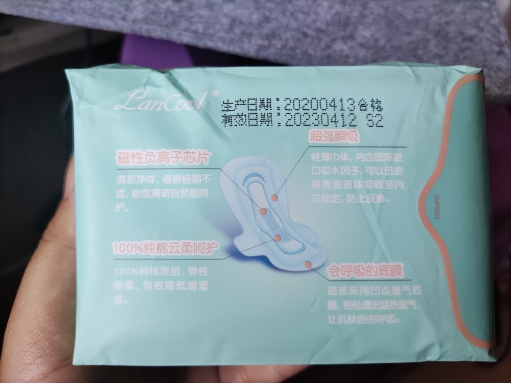 优点:吸水量大,干爽透气,包装袋的蓝色给人一种小清新的感觉。两包日用加上两包夜用,刚好够一个周期。
