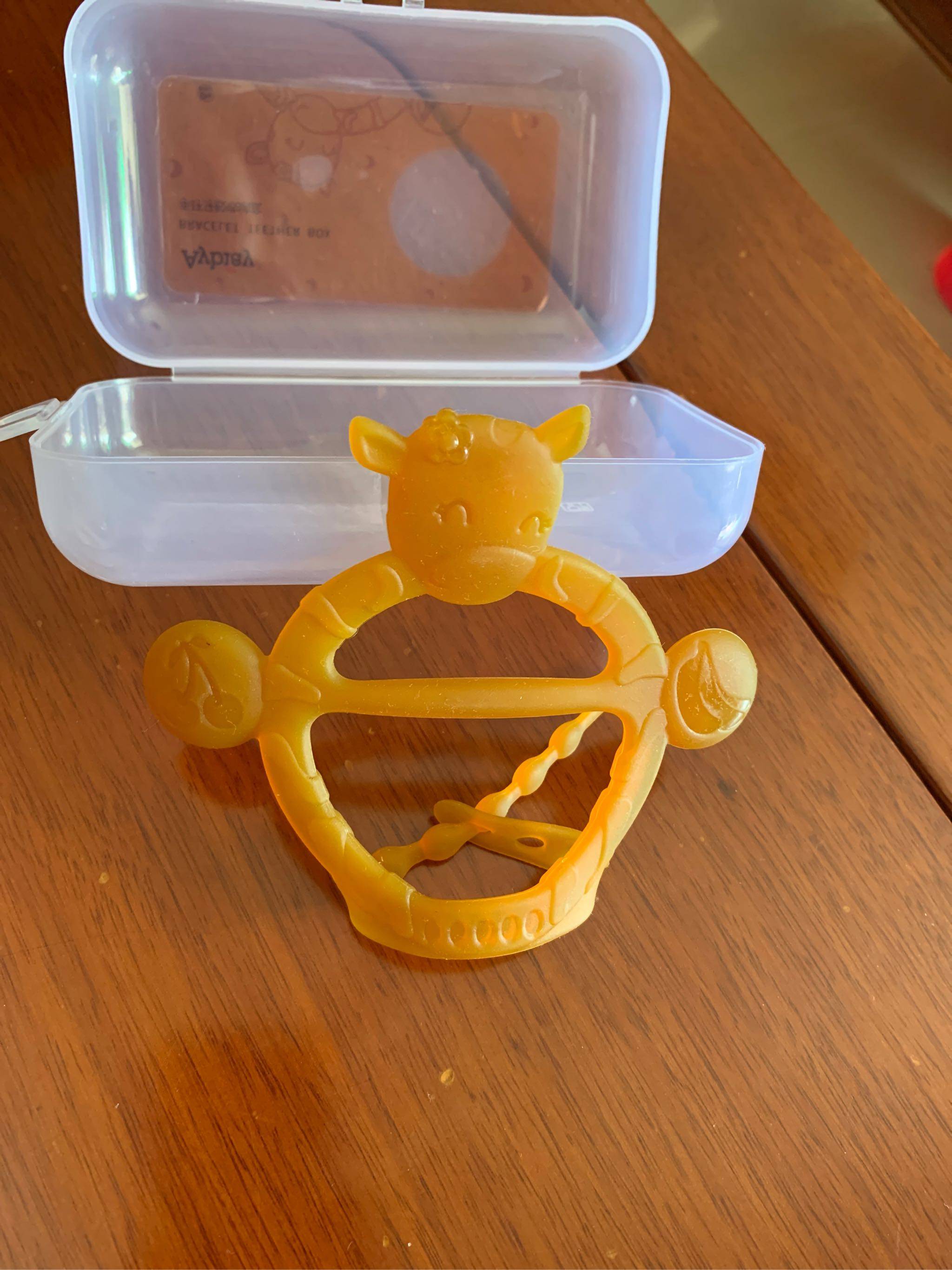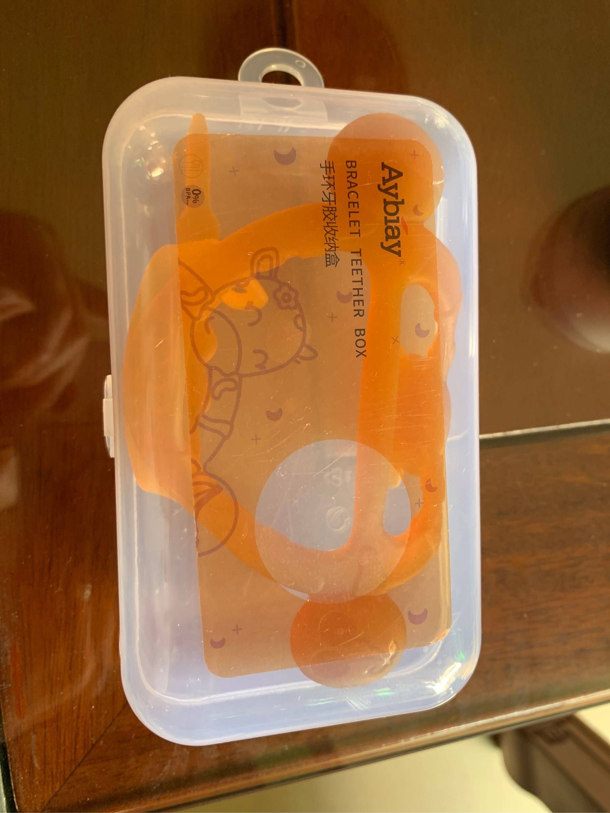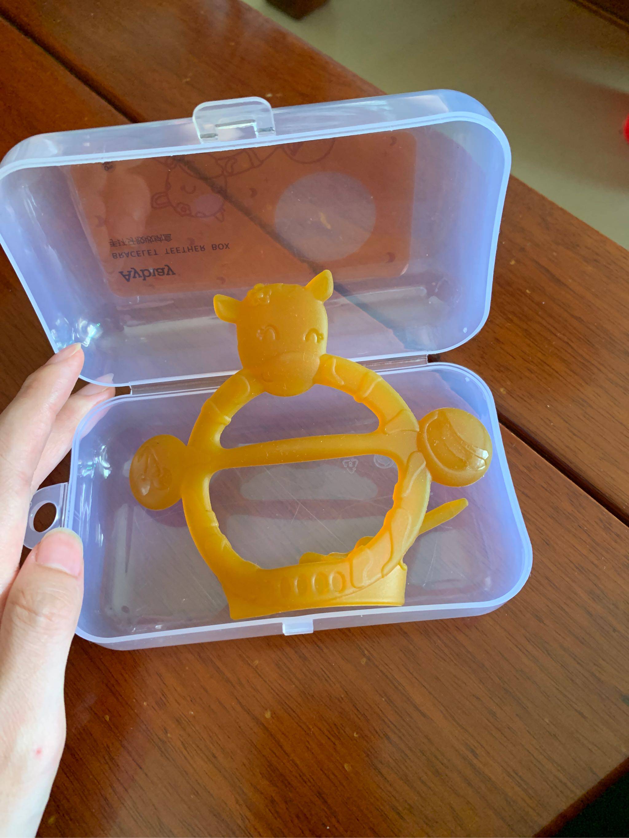 宝贝收到了,打开还有专用的收纳盒,收纳很方便,给宝宝戴手上让她咬放心而且无味,用的很放心。上面还有小牛图案小宝喜欢。