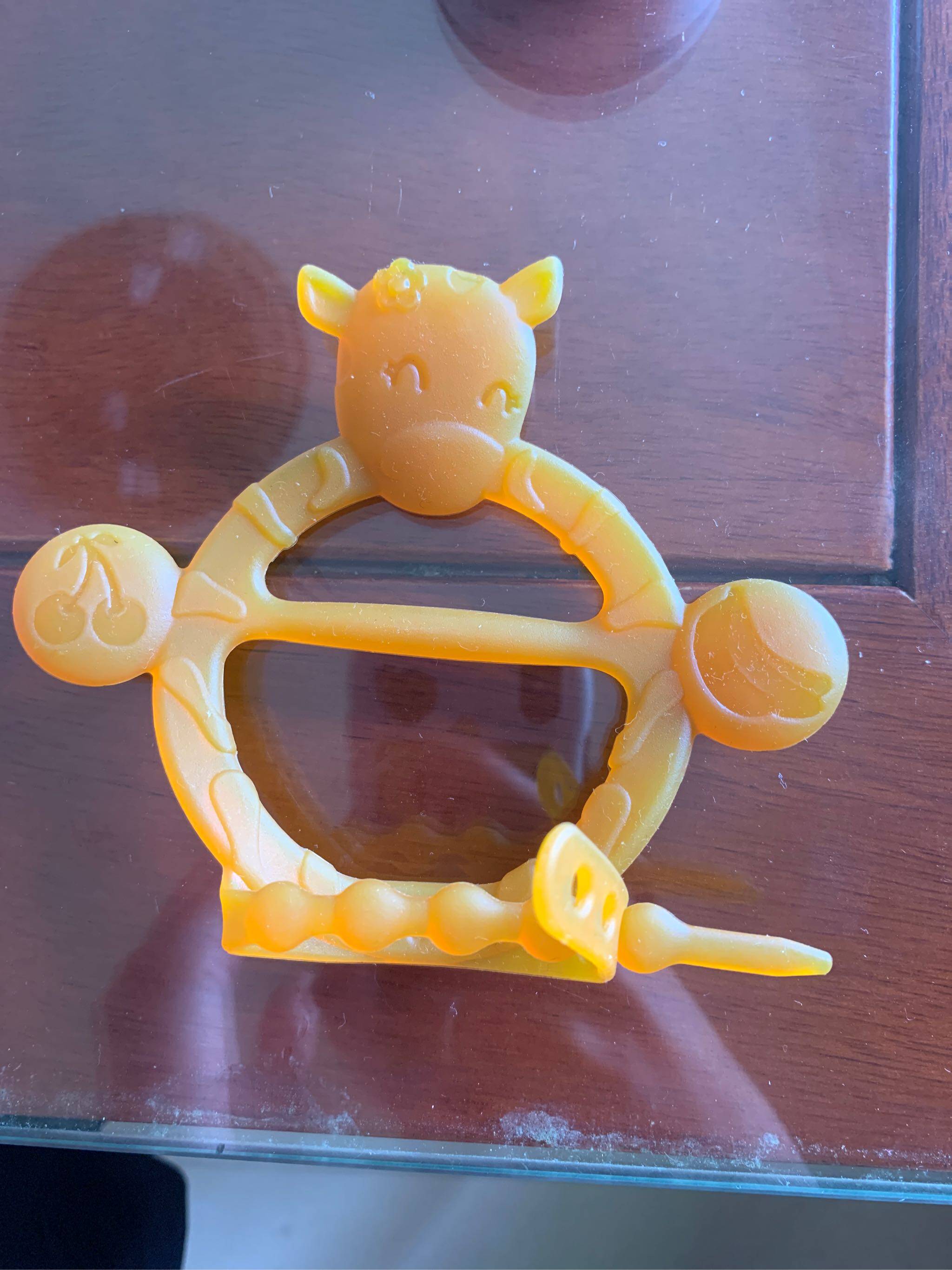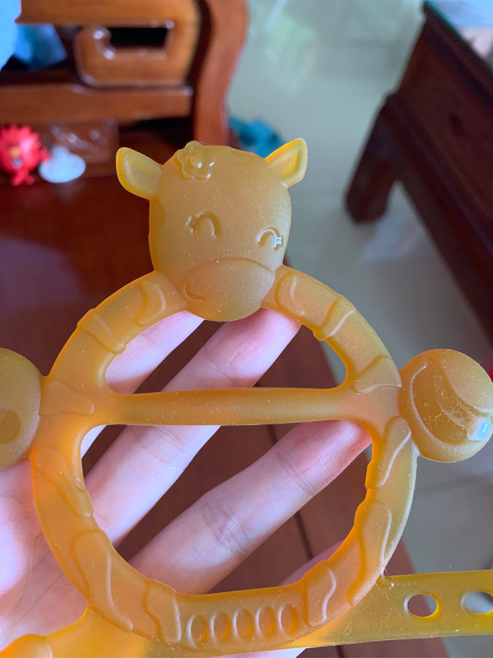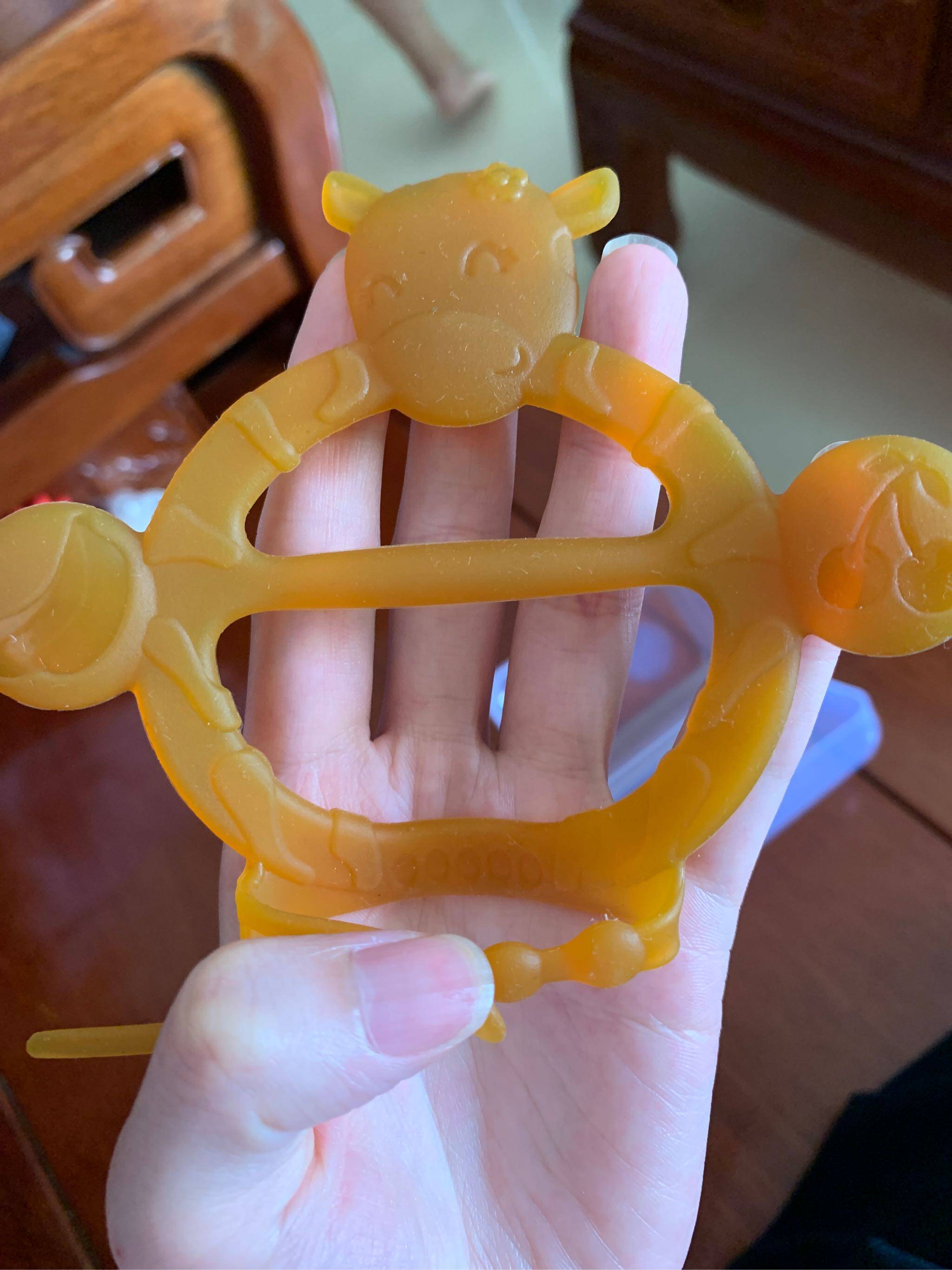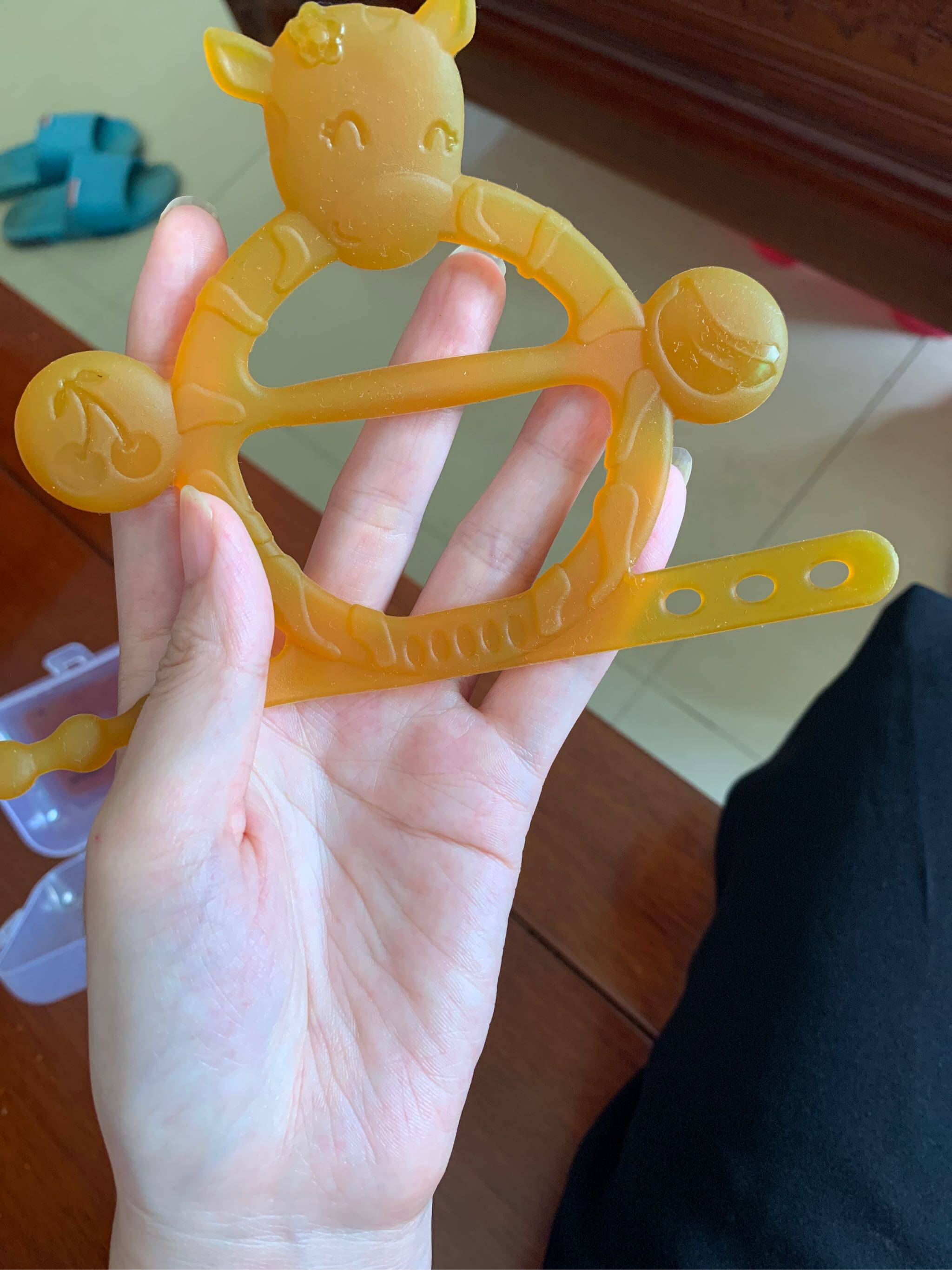 宝贝收到了,打开还有专用的收纳盒,收纳很方便,给宝宝戴手上让她咬放心而且无味,用的很放心。上面还有小牛图案小宝喜欢。