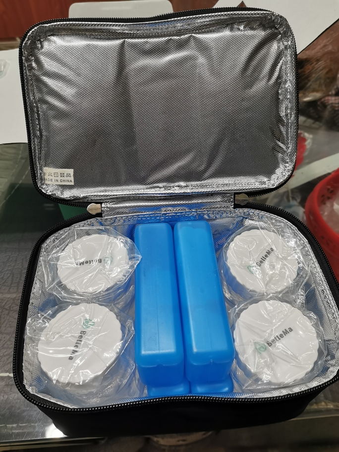 介绍一下收到的物品: 1、1只背奶包 2、4个蓝冰(可帮助冷藏10-12小时) 3、4个储奶瓶