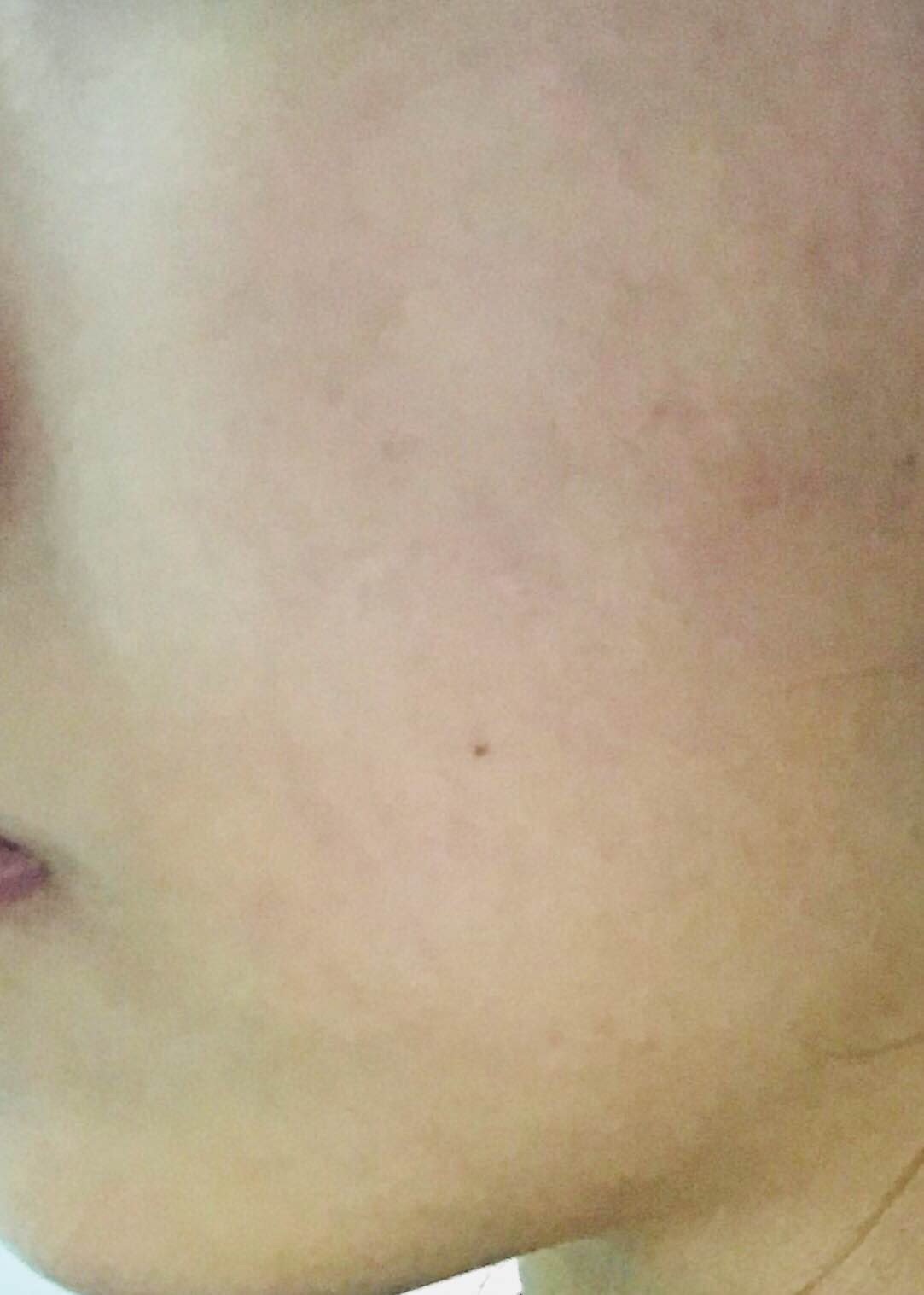 因为我选的色号是比较偏白的嘛,可以看出整体粉质比较细腻,这张图是没有拍匀称的,拍匀称之后和肤色融合的十分服帖,不起皮不卡粉,我是干敏皮,用的还算是比较舒服的了。