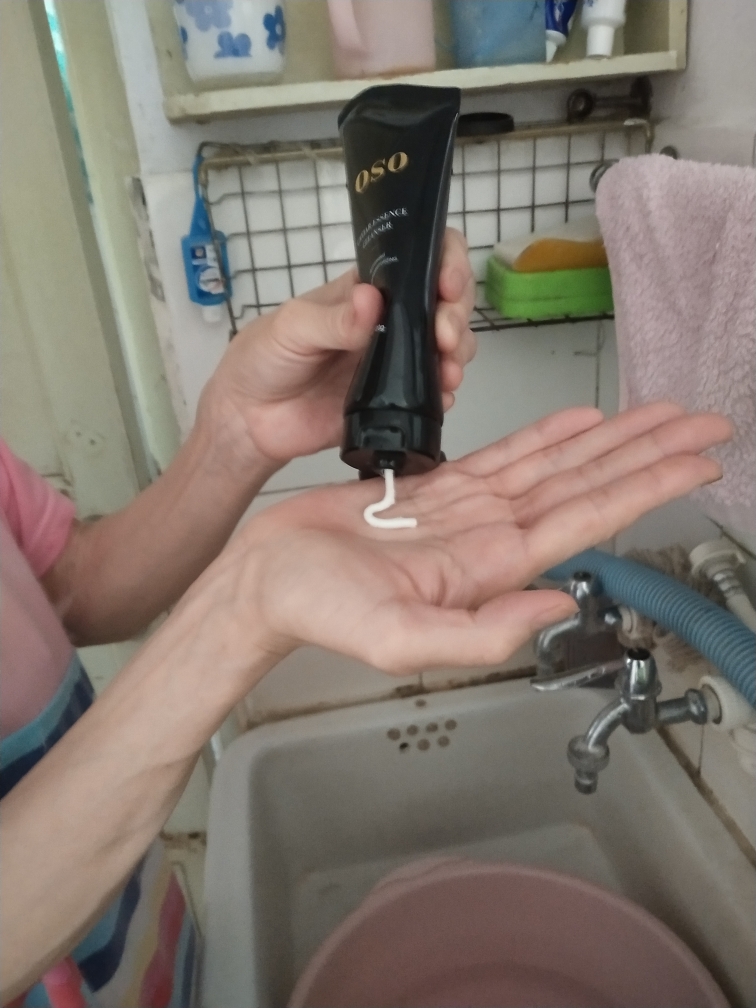 先用清水洗脸,然后把洁面乳挤在手心里,得用点劲挤,膏体有点稠,清淡的香气。