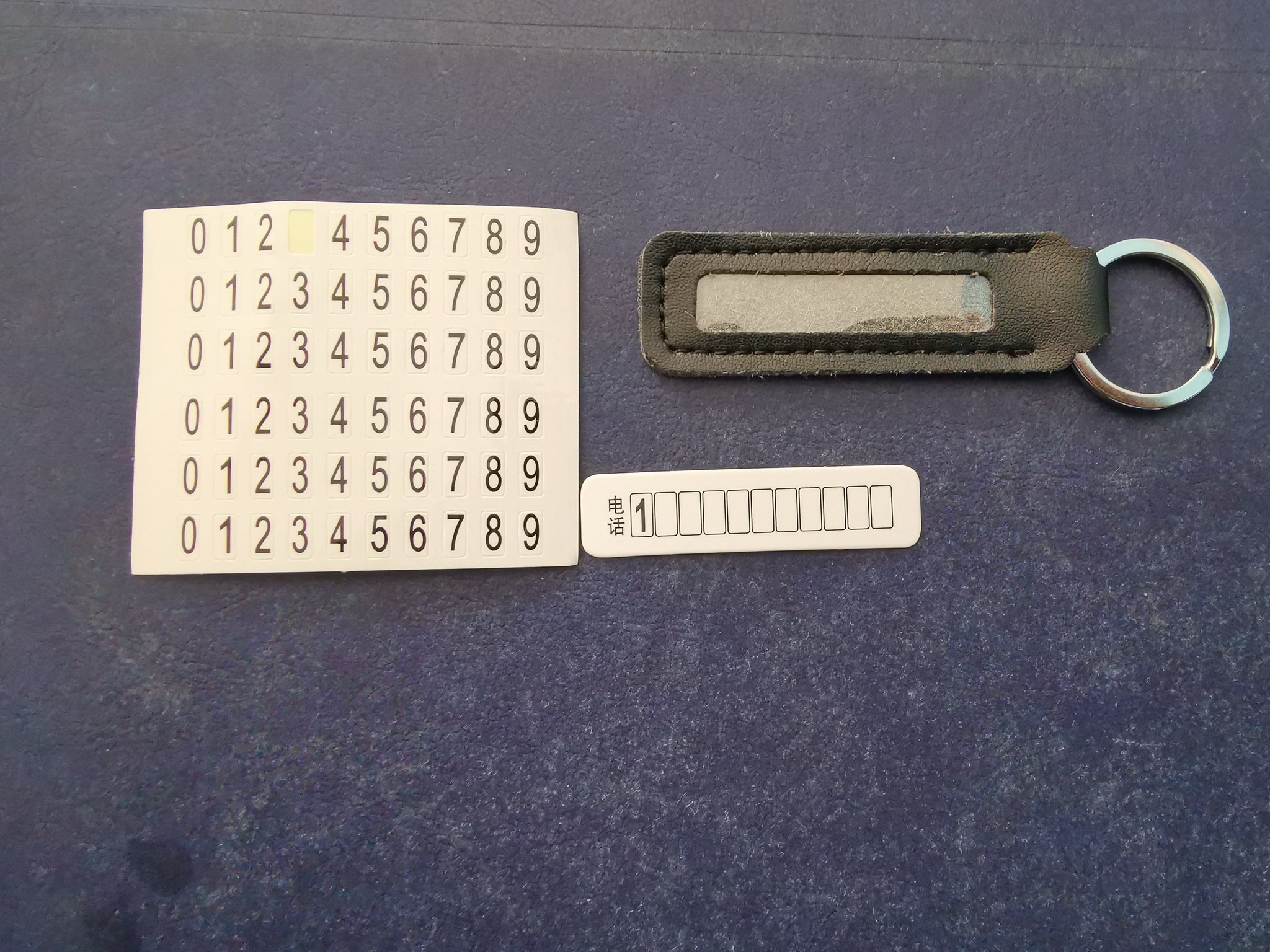 赠送的号码牌,当时觉得这个是不是太小了,后来想想,这个不是放在前档挪车的号码牌,是钥匙万一丢了的防丢联系电话,哈哈。太大了肯定带在身上不方便。但是由于太小,贴号码有点费劲。