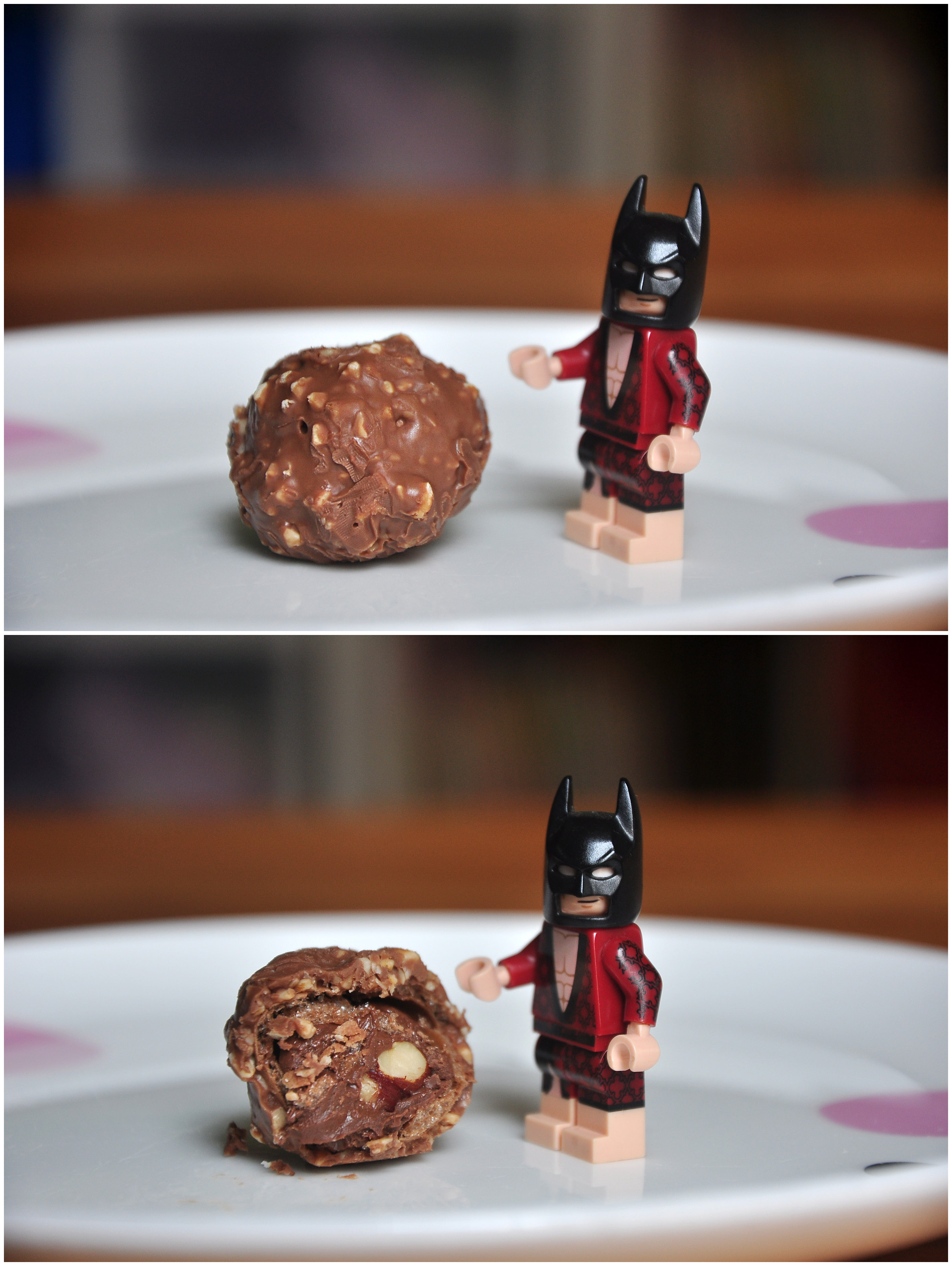 榛果威化巧克力的最外层是混合着碎榛仁的牛奶巧克力,往里一层是酥脆的威化,再往里则浓滑的可可软心,里面包裹着大颗的榛仁。一口咬下去,层层滋味各有不同,最突出的是巧克力的甜和榛果的香。这种多层次多口感的做法我觉得是费列罗与其他品牌巧克力最显著的不同。