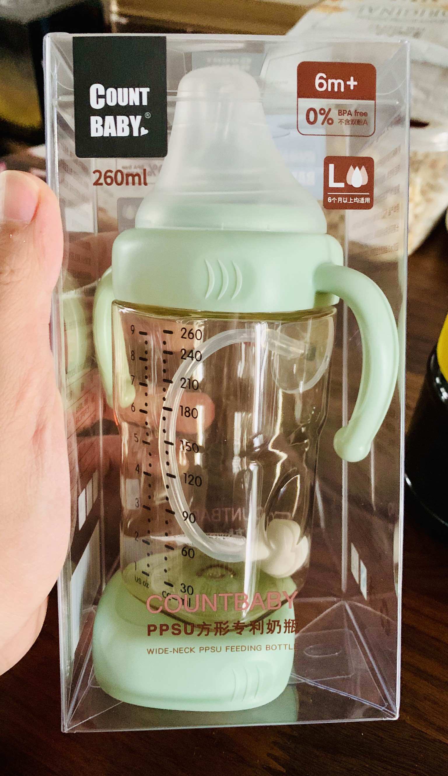 收到了260ml大号奶瓶 但是家里宝宝才2m 等大点可以用 ppsu材质很轻很方便 且防摔 小孩也能到时候自己抓握了喝奶 暂时不使用也可具备储物功能