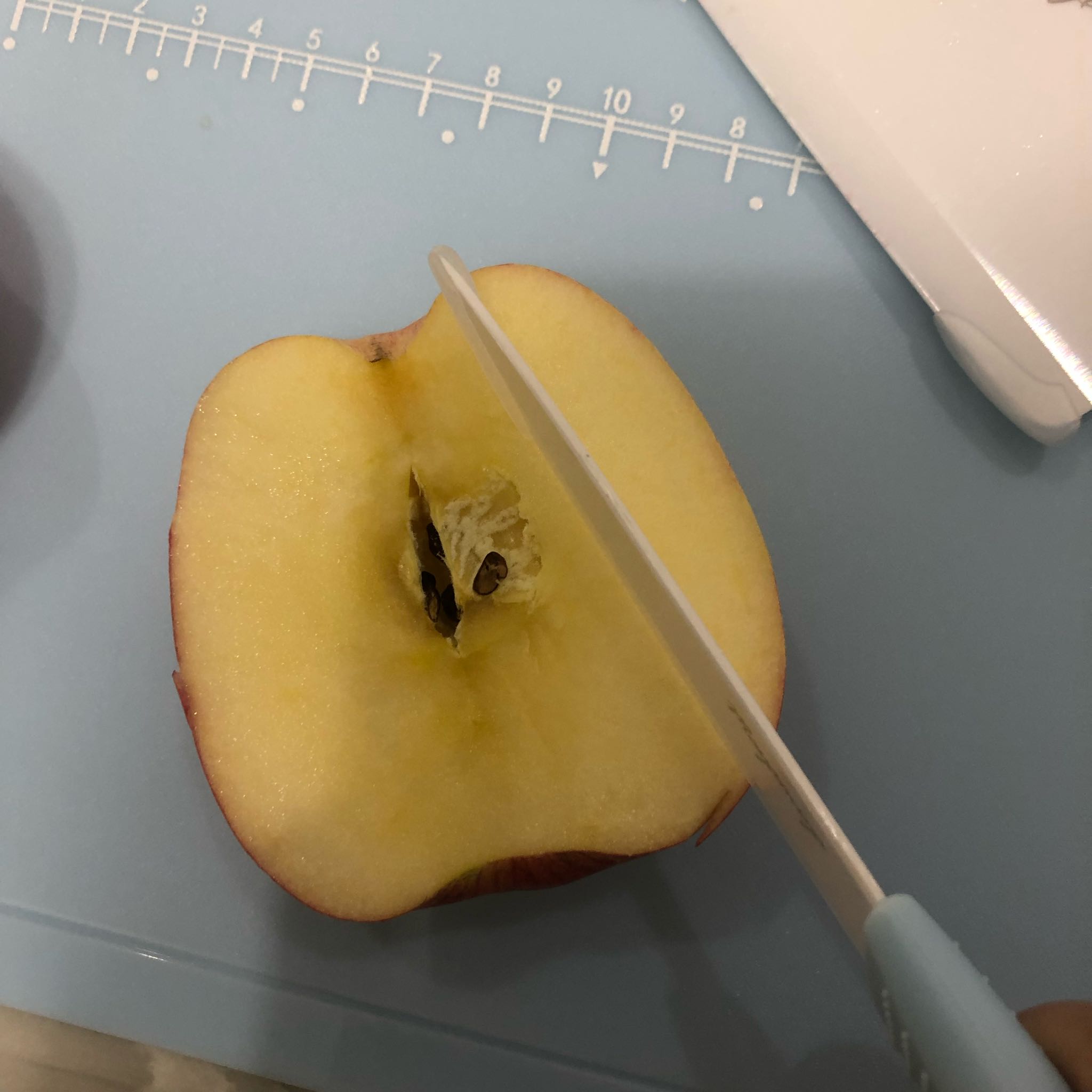 然后用大刀把苹果切成两半,真的超级省力,根本不怎么费力一下子就切成了两边。
