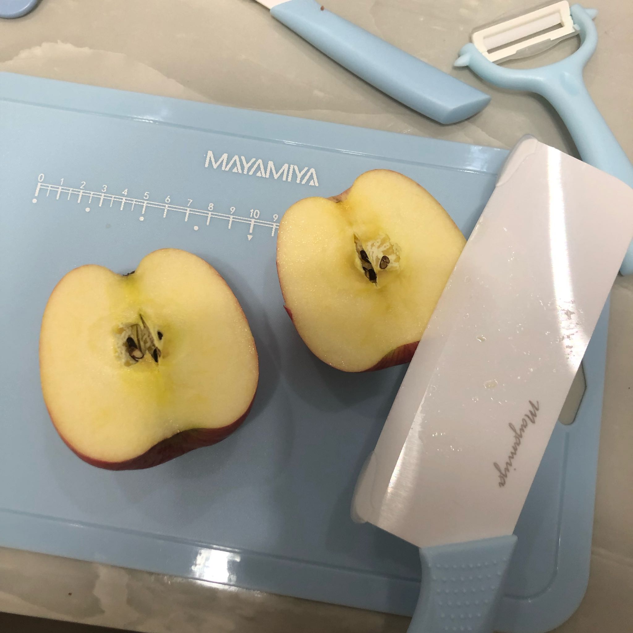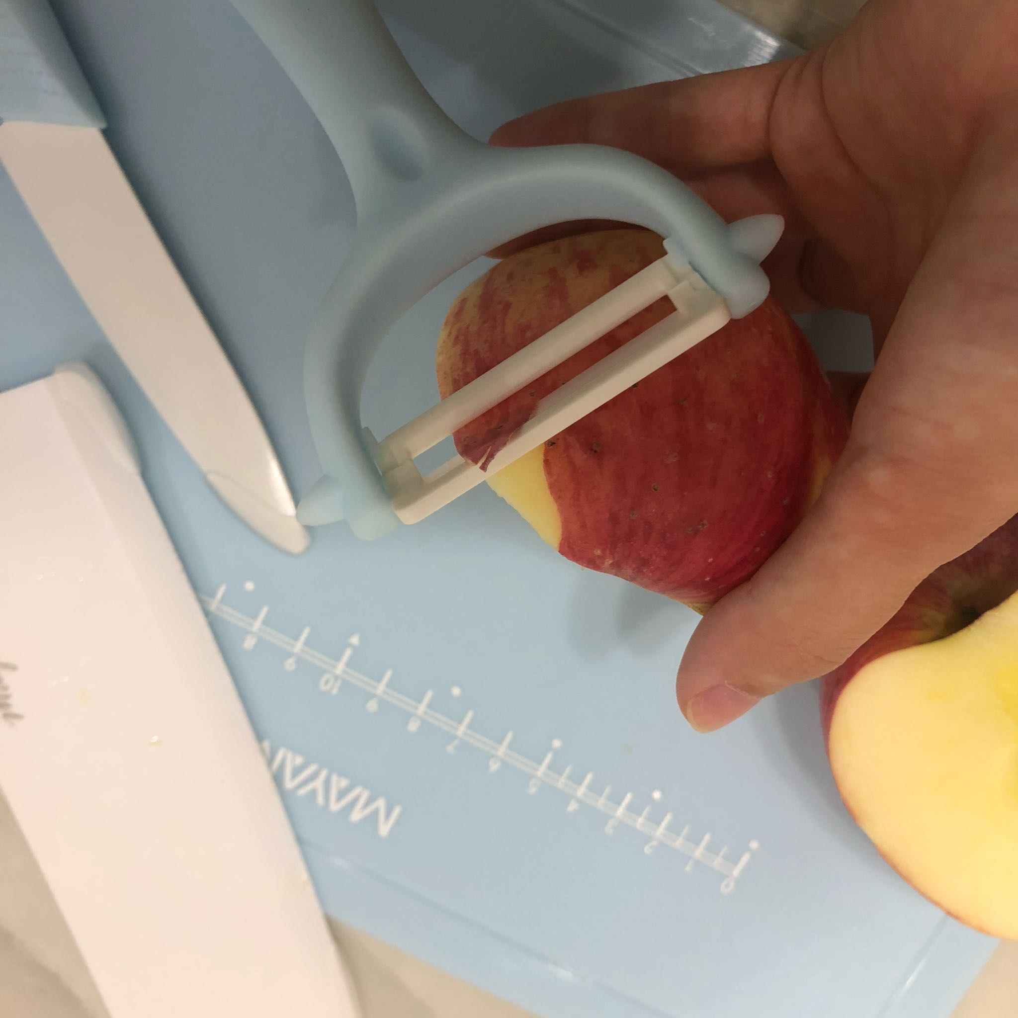 我先用刮的刮子给苹果削了一下皮,很好削,比我想象的要锋利很多,一下子就刮掉了