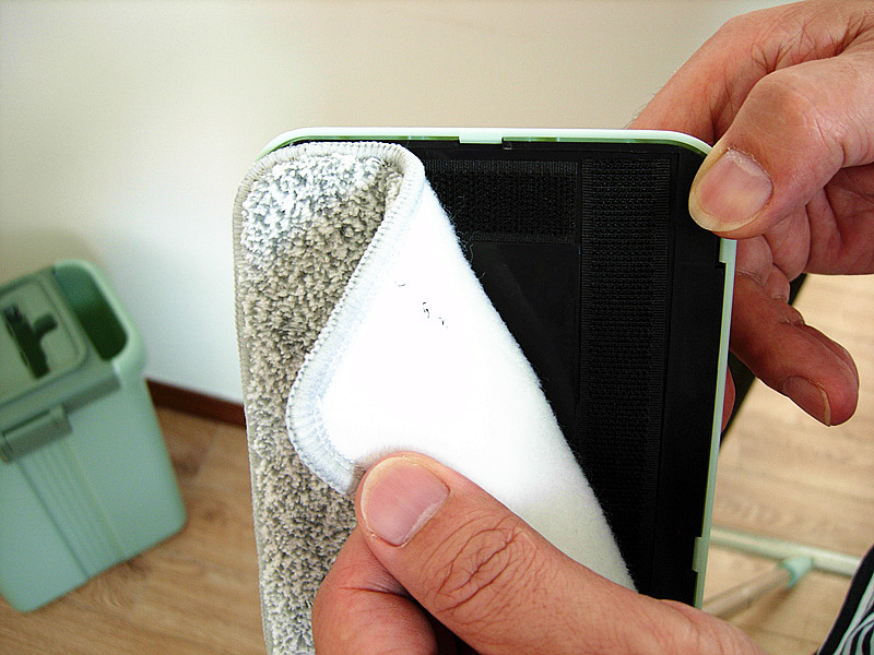 配备的拖布材质纤维细密比较厚实,吸附能力强,使用时也不容易掉毛,采用的是强力魔术贴的固定方式,装上后用手轻轻按压平整。它牢固度很好,可以反复撕拉,不用担心使用的时候拖布会脱落,以后更换拖布的时候也很容易。