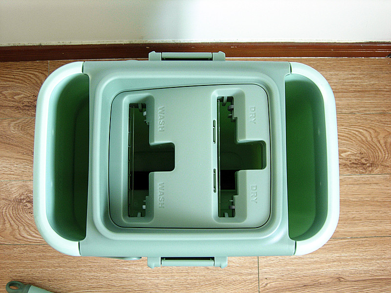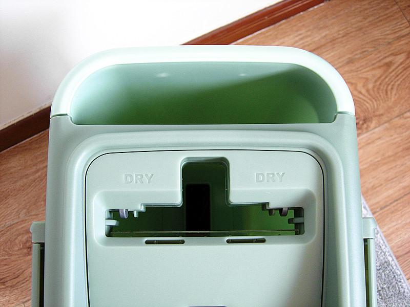 桶壁看着比较厚实,侧面安装有一个便携提手,使用时拿放更平稳。在桶的顶部两端各有一个卡扣,打开桶里面分为WASH和DRY两个不同的洗槽,用后的脏拖布很容易放进去分别清洗干净和甩干,真正做到了干湿分离,细节之处设计的很合理。