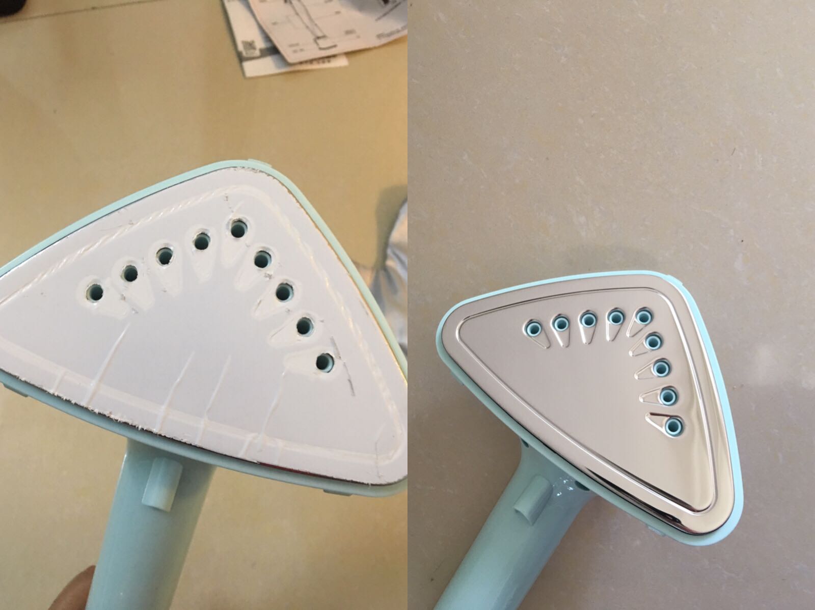 下面来说一下使用心得,首先挂烫机的蒸汽喷头上有一层保护膜,需要撕下来,喷头的材质是不锈钢的。