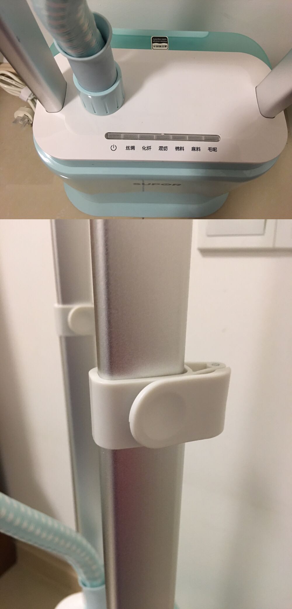 然后可以看到针对衣服面料不同,苏泊尔此款挂烫机有丝绸、化纤、混纺、棉料、麻料和毛呢六档可选,每一节伸缩杆卡扣的质量也非常好,很牢固。