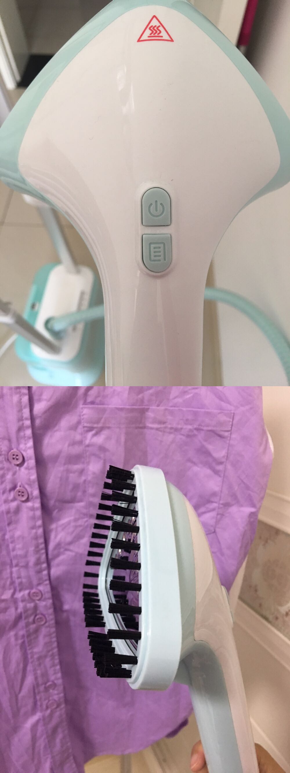开关和调档都在蒸汽喷头的手柄上,这一点很好,不用总是要弯腰调档了,先按开关键开机,再按开关键下面的按钮调档,傻瓜式操作,一直按就行,反正6个选项,按到哪个哪个灯就会变蓝,说明书上说非毛绒材质的安装毛刷使用会更好,下面安装毛刷来烫一下衬衣看看。