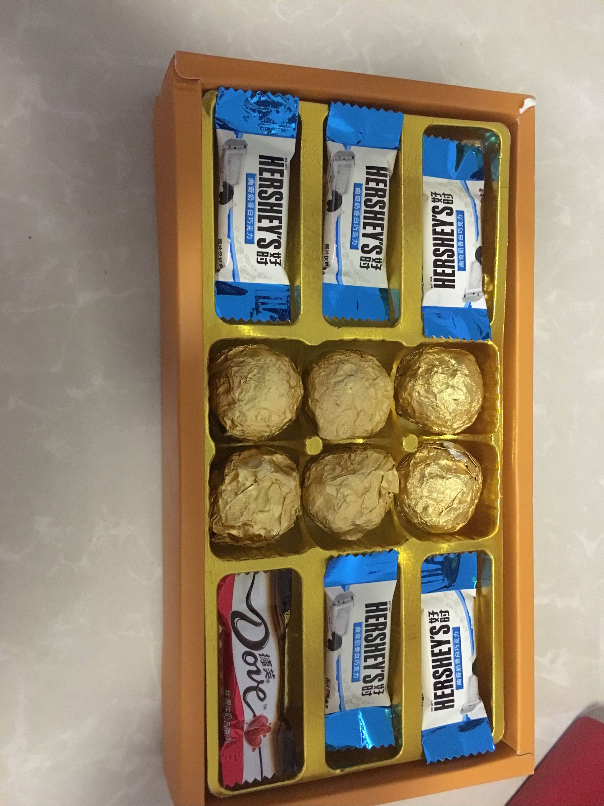 整体还是不错的~小巧精致~里面总共只有12颗~好时巧克力有5颗,德芙只有1颗~金沙有6颗~但是宝宝们每种都喜欢吃~她们一直都喜欢吃巧克力