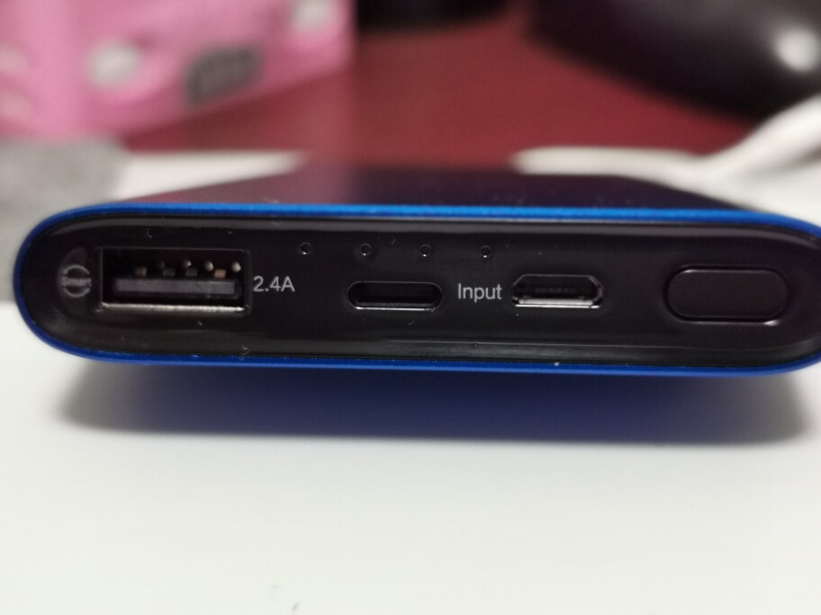 接口面,依次是USB输出口(5V2.4A),输入接口Micro usb、Lightning各一个,右面开关,上面是电量指示灯,整体中规中矩,遗憾的是输出接口只有一个。