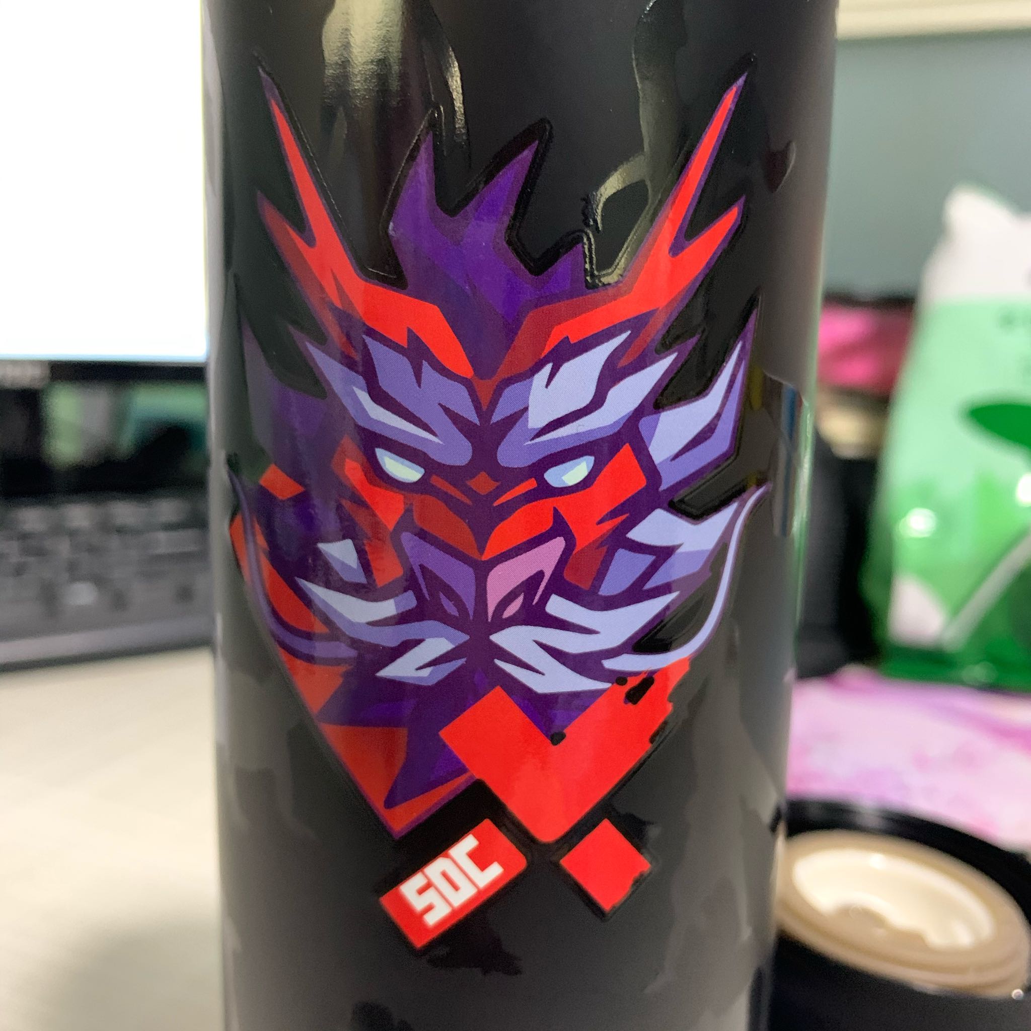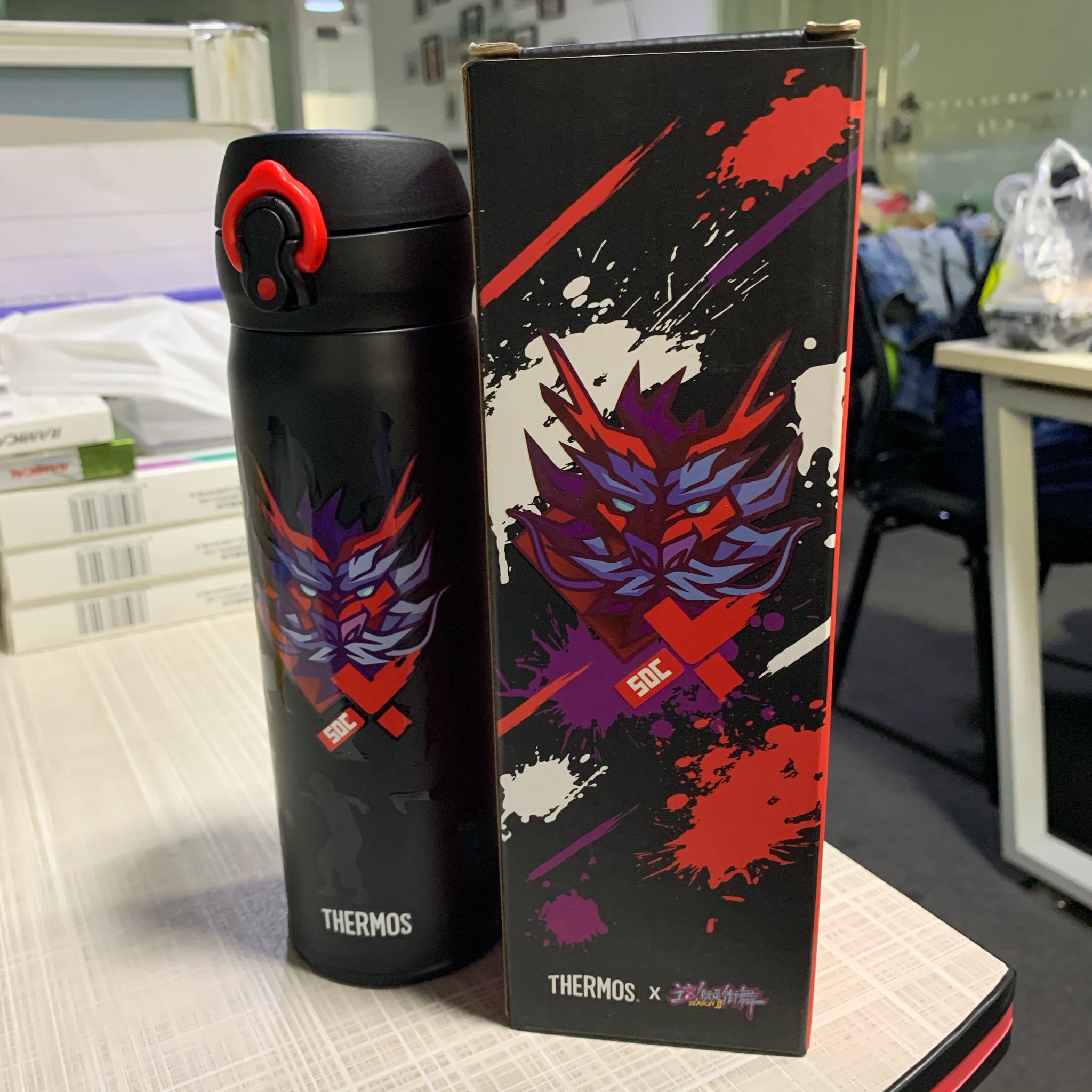 拆开盒子发现瓶身上好多跳舞的小人的 正面就是红色的龙头了 整个杯子是磨砂质感的 有图案的部分好像是有一层亮亮的胶 拿在手上比较轻