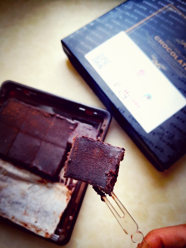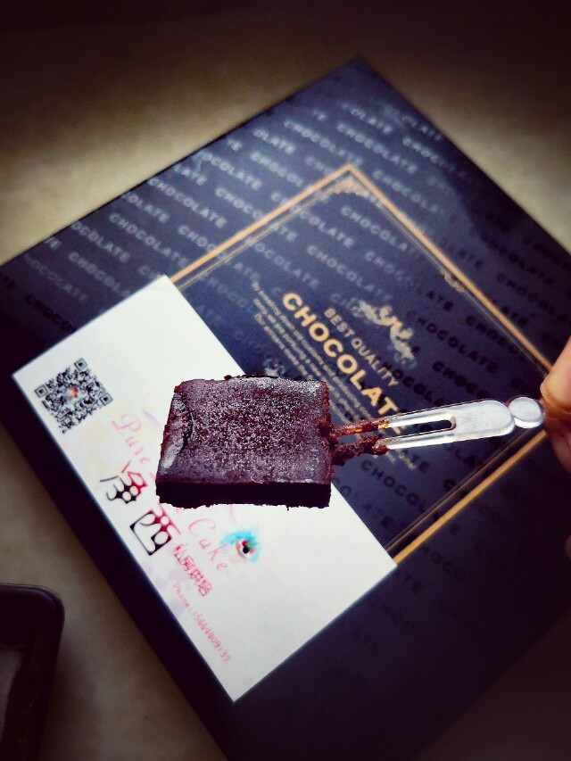 缺点:1.包装纸盒下面的店铺信息会有点违和,其实包装很漂亮,一看就知道是很高端的巧克力,白色的部分可以做成巧克力色的卡片,而且建议纸盒两端用透明胶粘上会更牢固。 2.巧克力的口味我选的黑巧,常吃黑巧含量95-100之间,所以这个甜度对我而言真的太甜了,以至于降低了黑巧本身的的苦苦的那种香醇味道。建议降低一半的甜度。相信选择黑巧的人,是喜欢那种它本身的苦苦的香醇味,只是个人建议。 3.天气原因导致产品本身部分融化,隐约可见表面的可可粉。这个不是产品的问题,我知道。但是真心建议内附的叉子换成铲型的,因为真的不好拿取,颜色换成金色或巧克力色都行,建议别再用这只透明的,因为不伦包装还是产品本身,都已经很高档了,这个略微显得有一点点low。